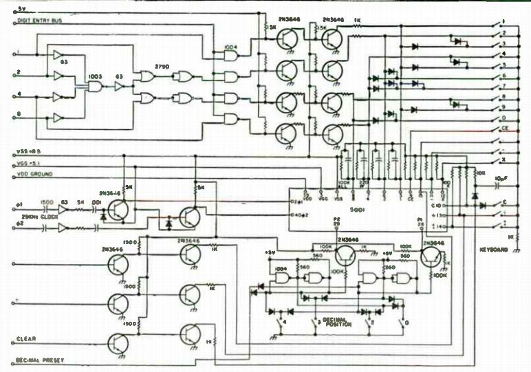 The accumulate and period modes cause the input gate to be controlled either manually or externally, and either timing or input pulses are routed to register "A" as appropriate. Readouts. Selection of readouts is guided by desired digit size, price, availability, power supply and driving requirements. Readouts for use with the 5001 chip must have decimal points to the right of the digit. Various readouts are suitable for use with calculator chips. The wide array of LED devices available suggests these would be preferred. Most calculator chips utilize multiplexed readouts, where like-segments of all digits are connected to a common bus line. Each digit is selected (turned on) for a brief period in turn. This driving method reduces wiring and driving hardware, because only eight segment drivers (including the decimal point) and one digit driver per digit are required. LED readouts may be driven by the newly available 75491 and 75492 Darlington driver arrays; however, as they are NPN devices, PNP pre-drivers may be required. Drivers shown in Fig. 10-23 are also suitable for driving LEDs, with the addition of limiting resistors. Incandescent readouts require drivers capable of handling substantial inrush currents. Digit drivers should be selected to handle 500 mA. The author's choice of incandescent readouts was influenced by cost at the time, and size of display. Present LED prices make them much more attractive. Selection of the 2N3569 for drivers was influenced by our junkbox stock, but the 2N2905 (PNP) is probably more suitable. The calculator data sheet shows PNP drivers, and use of the 2N3569 (NPN) requires the circuits of Fig. 10-23 to make the NPNs think they are PNPs. Diodes are required for isolation between each segment and the segment bus. Table 10-2. Calculate/Count Program. ![]() ---------------- Count Mode-khz Decimal Point Preset at "3" 1. Open Input Gate 2. Close Input Gate ( 1 second later) 3. Clear Display ( CE) A. Enter 5 High Order Digits From Register "A" 5. Enter Decimal Point 6. Enter 3 Low Order Digits From Register "A" 7. Clear Registers Count Nods-MHz Decimal Point Preset at "3" Prepsler Activated 1. Open Input Gate 2. Close Input Gate ( 1 second later) 3. Clear Display ( CE) 4. Enter 6 High Order Digits From Register "A" 5. Enter Decimal Point 6. Enter 2 Low Order Digits From Register "A" 7. Clear Registers Cling Moda-Hz 1. Open Input Gate 2. Open Clock ( Register "B") Gate 3. Close Input Gate ( When Register " B" Full) 4. Close Clock Gate 5. Clear Display ( CE) 6. Enter 8 Digits From Register "A" 7. Enter Three Zeroes 8. Enter " Divide" Command 9. Enter 4 High Order Digits From Register "El - 10. Enter Decimal Point 11. Enter 3 Low Order Digits From Register "8" 12. Enter "Equals" (" Divide") Command 13. Clear Registers (Delay New Count Cycle to Provide 2 Second Update) Elapsed Time Mode Route Clock ( MS or uS) Pulses to Register " A' (gated) Route Input to Control Input Gate Update Once Each Second Clear Register -A- 1. Clear Display ( CE) 2 Enter 5 High Order Digits From Register "A 3 Enter Decimal Point 4. Enter 3 Low Order Digits From Register "A Accumulate Count Mode Route Input Pulses to Register -A Update Once Each Second Clear Register "A 1 Clear Display ( CE) 2 Enter 8 Digits From Register A - Time-of-day Mode Blank 2 Digits Update Once Each Second 1 Clear Display 2. Load Register "A • Time-of-day Register 3. Enter 8 Digits From Register " A • Calculate Mode Lock Out Data Entry Sequencer (Keyboard Always Live) Continuous Count Mode (Hz, kHz. MHz) Enable Automatic Count Restan ( input gate) on Register Clear Siva' Single Count Mode (Hz, kHz, MHz) Manual Count Restart ( input gate) -------------------- ![]() Fig. 10-24. Calculator Input Circuits. Driving circuits for Nixie and Numitron type readouts are included with the calculator data sheet. Table 10-2 is the calculate/count program. The 5001 chip provides 12 digits, which is handy for calculating, but not really needed for counting. Although fewer than 12 can be used, you must then either provide overflow detection or take a chance on errors. Note also that there are restrictions upon the size of the arguments that the 5001 can handle without overflow. These restrictions cause an overflow if you at tempt to calculate the frequency to too many decimal places. (You have the choice of zero, 1, 2 or 4 decimals.) The Calculator. The 5001 Cal-tex chip widely advertised is probably the most suitable for this application. Data input is modified BCD, and is readily driven from TTL Circuits. The 5005 and several others use multiplexed inputs, which require more complex input interfacing. Although no investigating was done, the 4016 CMOS switches should be suitable for use with multiplexed inputs. The 5001 is available in 2 voltage versions. If you are not sure which version you have, it would be sensible to use the lower voltage supply to test it. This one turned out to be the 13 volt version. If yours works at the lower voltage, it is a low voltage unit and should not be tested at the higher voltage. TTL and ECL are devilish creates unless adequate power supply by-passing is done. The surplus boards noted also yielded some very handy power bus strips. These are composed of two 313" wide strips of copper foil separated by a thin dielectric. Feed terminals are provided at convenient locations which permit short leads to ICs. Even with use of these bus strips, 1.0 mF (miniature electrolytic) and 0.1 (miniature ceramic disc) capacitors were liberally distributed from +5 volts to ground. A.1 discap across the supply terminals of every TTL and ECL IC is recommended, if you don't use bus strips. Failure to provide these bypass capacitors will result in mis counts at best, and total non-operability at worst. Figure 10-24 shows the various input circuits required for the 5001 chip. Pins 5,6,7 & 8 are 1,2,4 & 8 BCD lines, with the exception that a zero is read in as a " 10" (lines 2 & 8 low). A low reading on any line