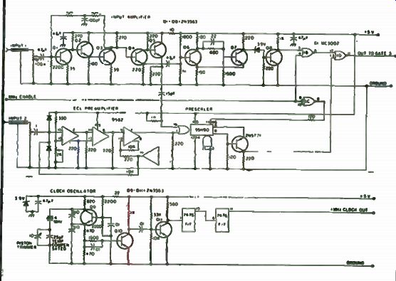 Flip-flop 16A is normally enabled, and provides 20 millisecond pulses to the two data entry sequencers. Gate 25A signals the bus converter that there is valid data on the bus, and the converter in turn presents this data to the calculator for 10 milliseconds. The action of flip-flop 16A is inhibited (and no digits are therefore entered) during decimal point entry. Although the 5001 data sheet states 4 ms is required for data entry, anything faster than the 20 ms data entry cycle rate chosen was found to be unreliable with the bargain price 5001. Flip-flop 16B switches "on" in response to a pulse on the start-display line (input gate closure). Flip-flop 17A is then permitted to toggle "on," which unlocks the register "A" data entry sequencer and the "digit entry" line (gate 25C). Register "A" entry sequencer then counts up (entering dies), and when it reaches a count of "8" the stop-display line permits flip-flop 17A to toggle off, which resets the entry sequencer to "zero" and stops further entry of register "A." In the "Hz" mode, a count of "8" on the register "A" entry sequencer permits flip-flop 17B to toggle "on" which enables the 8281 register "B" entry sequencer ( 18) and unlocks the digit entry line at gate 25C. Register "B" entry sequencer then counts up, entering register "B," and at count 15 gate 24D enables the flip-flop 17B "K" input. The next count pulse causes sequencer 18 to return to a "zero" count, and simultaneously toggles flip-flop 17B "off," which disables divider 18. Input Amplifier and Prescaler. Details of the input amplifier and pre scaler are shown in Fig. 10-25. The input amplifier uses low-cost high speed 2N3563 transistors throughout. The input amplifier has a passband from 1/2 Hz through at least 150 MHz. Some resistor changes were found necessary to optimize response. The 9582 ECL preamplifier was found to have less sensitivity than the discrete preamp, and stability proved a problem. In retrospect, we would eliminate the ECL preamp and use the discrete preamp for all input signals. Clock Oscillator. Time base stability is very important if accurate counts are to be expected. The oscillator circuit was chosen after much experimentation. The crystal is a 4 MHz HA type (high accuracy) ordered for room temperature use. This frequency seems to be about optimum for thermal stability, and use of a series/parallel combination of NPO and negative temperature capacitors for the crystal series capacitor permits stability to be adjusted. The 10 pF capacitor is a glass piston trimmer can be anything smaller than 10 pF (4 pF probably is about right if you can find one). Q9, Q10 and Q11 are 2N3563 or 2N4274. Use of this oscillator permits stability to one part in 10 period. Only a very slight difference in time keeping ability was noted when the unit was run "warm" for a similar period. Mode Switching. Use of 8 open collector TTL 2 input NAND gates (or inverters) connected as 4 SR flip-flops permits a completely electronic mode switching system. The configuration of these flip-flops is set by pressing one of the mode push-buttons. The flip-flops then "remember" what mode switch was last pushed. Outputs at the first three flip-flops are decoded by six 3-input NAND gates. The fourth flip-flop is used to control the single count function, and also, together with the "elapsed time" mode, to provide an "accumulate" mode. LEDs indicate the mode presently in use. Operation of either the kHz or MHz button presets the calculator to 3 decimal places. This permits display of the decimal in the appropriate location. An extra decimal point LED was mounted between the fifth and sixth digits (from the right) and connected via a driver to the MHz function. This provides a reading of XX. XXX. xx in this mode. (Although it might appear that the MHz function should preset 2 decimal places, the decimal point is entered in the proper place by the data entry logic.) Germanium diodes should be used in the "decimal preset" line to ensure that TTL inputs are brought below their switching thresholds. Power Supply. In order to avoid loss of power to the digital clock, a battery standby has been provided for the clock circuits. Referring to Fig. 10-29, a constant current regulator, comprised of a 2N3055 and a 2N3569, maintains the Nicad battery in a fully charged state. The voltage regulator using another 2N3055 and a 2N3698 is somewhat unusual. A voltage doubler driven by G1 and G2 provides sufficient current to the 2N3055 to maintain it in saturation when the input voltage drops to 5.2 volts or less. This ensures adequate output voltage to drive the TTL clock circuits until the battery voltage drops to about 4.7 volts. At this point, zener diode Z1 (with diodes D5 and D6) reduces the base current to the 2N3055, which results in a drop in output voltage. Lowered voltage to the TTL countdown chain causes a loss of clock drive to the voltage doubler, and results in a complete shut down of the voltage regulator. Deep discharge of a Nicad battery would result in permanent cell damage.