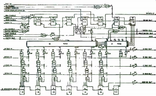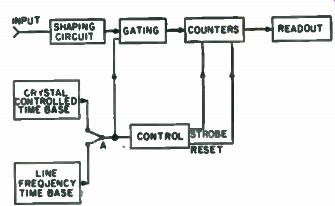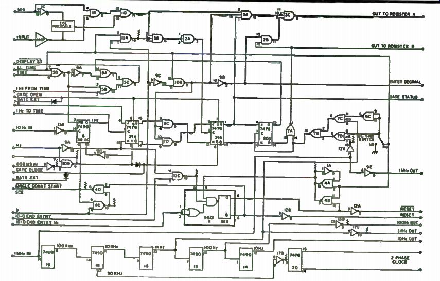 ... routed to register A via gates 3A and 3C. FF20A was also set to toggle "on" by FF 21A and the first 1 MHz pulse at the count input of FF 20A causes it to turn on, and gates 5A and 5C cause the display-start line to go high. This readies the display entry logic. ( 1 MHz pulses are routed to register "B," but are not used in this mode.) After exactly one second, FF 21A switches off, and conditions FF 21B to switch off. The next input pulse causes FF 21B to switch off, and gate 3A closes. Register "A" now contains the count of input pulses during a one second interval. FF 20A promptly switches off (about one microsecond later), the display-start line is brought low, and the digit entry logic is initiated. When all digits have been entered (about one-fourth second), the 10/0 line goes low, and the one-shot generates a 1 ms reset pusse, which clears registers "A" and "B" and simultaneously sets decade divider 8 to a count of 9, through gate 4D. About one-tenth of a second later (in the continuous count mode), divider 8 reaches a full count, transmits a pulse to FF 21A, and a new count cycle begins. Single Count. When line D is high, after the count/display sequence, gates 4C and 4D are locked up by the reset pulse, and divider 8 is held at a count of 9. The start (SCE) line is brought down each time the single count push-button is operated, restarting divider 8, a new count, and resetting gates 4C and 4D. Calculate Frequency (Hz) Mode. A logical 1 on the Hz line enables gate 10D, prevents FF2 1A from resetting from its count input and prevents (gate 10C) the 10/0 line from initiating a reset pulse. Gate 3A is enabled via FF 21A and FF 21B, similar to the kHz mode. It should be noted that FF 20A (which follows gate 3A by one microsecond) routes one microsecond pulses via gate 7A to register "B" in all count modes. In the Hz mode, when register "B" has counted 800 milliseconds, it sends a pulse via gate 10D to reset FF 21A. The next input pulse closes gate 3A via FF 21B, and gate 7A closes about one microsecond later. Register "A" now contains the number of input pulses which were counted during the time (in microseconds) stored in register "B." The display-start line causes entry of the number stored in register "A" a "divide" function, the period measurement in register " B" and a second divide (equals) function (which calculates the frequency), and initiates a reset pulse via the 16/0 line. Elapsed Time and Event Counting Modes. When the elapsed time line is high, divider 8 is disabled via gate 5D, and either input pulses or timing pulses are routed to register "A," depending upon the status of " D" (gates 9B, 9C and 10B). Microsecond or millisecond timing pulses may be selected by a back panel switch. In the elapsed time mode ("D" is low), the gate may be operated via the regular counter input, or via the manual or external gate inputs. Pressing "Single Count" and " Elapsed Time" together selects event counting, and input pulses are routed to register "A" when the gate is opened manually or externally. In these modes, display-start occurs once each second (gates 5D & 5B), and the reset generator is disabled via gates 1A, 4A and 4B. A single reset pulse is generated each time this mode is selected, which permits each count to start from zero.
