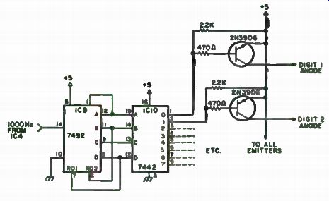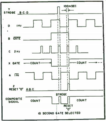... the 7492. Normally this IC would count to 12 and reset to 0, but with the 7410 gate connected to the A, C and D outputs, it will be forced to reset at the count of 11. Zero detecting the outputs with a NOR gate and NAND gate will produce a pulse that is high for 10 seconds and low for one second, which is the time between reset and the next input cycle. Another gate of the 74LS00 is used to invert this pulse. By combining the inverted gate pulse with the 1 Hz and 2 Hz signals, and then inverting the outputs of the other two gates of the 7410, the Strobe and Reset 0 pulses are generated and transferred to the rest of the counter. Through trial and error it was found that there had to be a minimum amount of time between the two pulses and this circuit provides it. Unfortunately, due to the minimum pulse width needed to reset the 7490s in the counter (50 nsec), the fastest gate time allowable is . 001 second. This is probably faster than needed anyway. The current limiting resistor for the LED should be chosen for the particular LED being used. Generally, about 180 ohms should be right. Any color may be used.