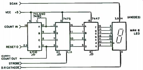 The outputs of the 7442 are active low. That is, the output selected is at ground and all others are high. Grounding the base of a PNP transistor turns it on and switches Vcc to the proper LED. Because the 7492 is wired to divide by 10, the scan rate figures out to 100 Hz. This is fast enough to eliminate any flickering, but allows enough brilliance for normal room fighting. With all new parts, the DSU costs about $6.25. Decimal Counter Unit. The DCU is constructed on a 3.5" by 1.7" PC board. Except for the first DCU, all use standard 7490s as counters. The first DCU uses the 74LS90 by Fairchild, which was described earlier, for a 50 MHz count rate. Also, each DCU has a 7475 quadruple bistable latch, a 7446 or 7447 BCD to seven-segment decoder, and a socket for the LED. Any Monsanto LED may be used here as the pin-outs for most of them are identical. We used the MAN8, which is yellow, simply because we had them. However, the large . 6" MAN6 or the . 27" MAN7 will also plug in. Both of these are red. For the LED socket, use the already preformed side mount socket or be cheap and bend the leads of a wire-wrap socket. The 7475 is used to transfer the accumulated count of the 7490s to the display when strobed by the Gate Control Unit. A logic one is needed on the clock inputs to transfer the input information. When the clock is low, the latch will store the information until the next strobe pulse. li the input has not changed, the output won't either. If new information is present at the input, the outputs will change to agree with the inputs. The outputs of the 7475 are connected to the inputs of the 7447 which decodes the BCD to the proper coding to display the corresponding decimal number on a seven-segment readout. Four of the DCUs have provision for using the decimal point so that the display can be wired to show the frequency in either kHz or MHz. One need only wire the proper decimal point to ground through the gate select switch.