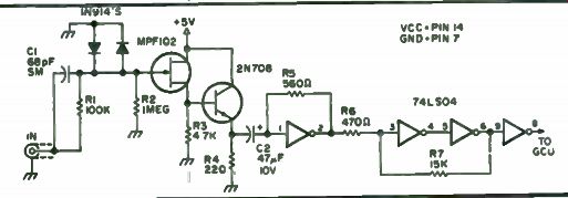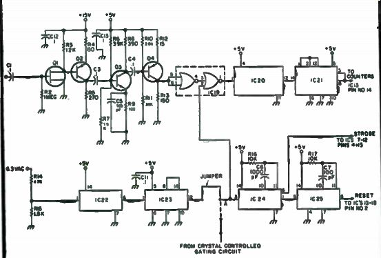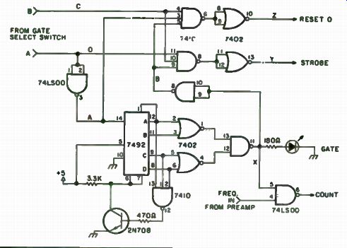 The cost of the DCU will be about $6.50 for the 50 MHz version, and a little less than $6 for the standard version. Gate Control Unit. The original circuit for this was unsatisfactory, as the time needed for the strobe and reset 0 pulses was equal to the gate time. On the faster gates this was no problem, but on a 10 second gate it could be annoying having to wait 20 seconds for updating the display. So we rede signed it with the basic idea that we wanted a 10 second gate and the resets to occur within one second. A look at the timing diagram may help in understanding the operation of this circuit. Refer to the schematic for lettered lines. Note also that the board has a gate LED incorporated on it, eliminating the need to front panel mount one. It will show through the display window to the right of the digits. The GCU is built on a 3.5" by 1.7" PC board. It consists of four ICs: a 7492, divide by 12; a 7410, triple-three input NAND gate; a 7402, quadruple two-input NOR gate; and a 74LS00, chosen also for the high toggle speed. Let us assume we have selected a 10 second gate. Through the gate select switch, 1 Hz and 2 Hz signals are routed to the inputs of the GCU. One gate of the 74LS00 is used to invert the 1 Hz and apply it to the clock input of ...