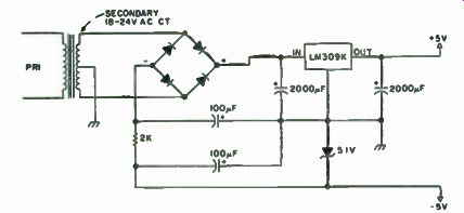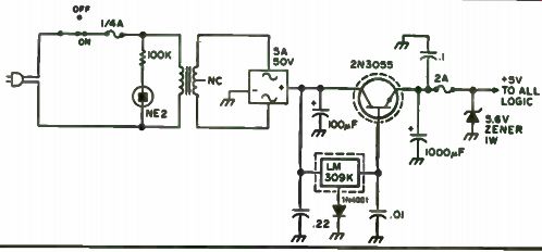 This is also the cheapest unit, costing about $4.00 with all new parts. The Preamp. We used a 74LSO4 to obtain a 50 MHz working speed, a 2N708 for Q2 and a slightly different input scheme, in addition to the k20AW counter. Finally, sensitivity became livable. A scope and rf signal generator (HP 608D) showed a sensitivity of 10 mV from 10 MHz on up. At audio frequencies, about 50 mV was needed for reliable operation. The reason for all that extra space on the board layout is that in the future, an onboard prescaler using the 11C90 by Fairchild will be incorporated. Provided, of course, that the circuitry is as simple as that using a 95H90. With the 11C90, the counter should operate in excess of 500 MHz. Power Supply. Due to heavy current demand, about 1.3 amps, we decided on the circuit shown to regulate the 5 volt line, rather than use two LM309s. All components can be mounted on the rear panel with appropriate mounting hardware and solder lugs. Heatsink the pass transistor and LM309K. You can use a bridge rectifier module or individual diodes. They should be rated for at least 5 amps at 50 volts. The transformer is a 12. 6v AC at 3 amps, or parallel two smaller rated ones. Use a 2N3055 for the pass transistor or a suitable substitute with similar ratings.
