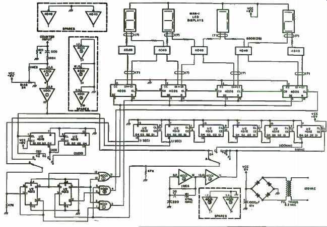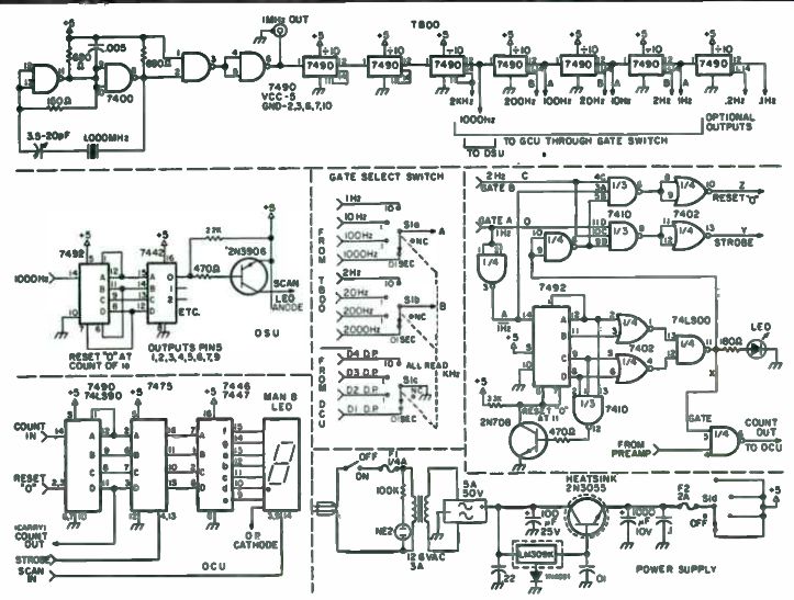 Zener diodes Z1 and Z2 with their associated forward diodes must be chosen to provide about 5.7 volts at the base 9f the N3055, and about 5 volts at the base of the 2N3638. The main 5 volt supply uses a PNP 2N2612 transistor to provide about 4 amperes of regulated DC, controlled by the 1 Ampere LM309K. The second 2N2612 is diode connected to provide a voltage drop similar to the base-emitter drop of the pass transistor, and as it is mounted on a common heat sink provides thermal stabilization. MOS voltage levels are provided by simple zener regulators. Note that Vdd is grounded, wheras the 5001 data sheet references voltage levels to Vss. Lamp power is unfiltered, which reduces readout brilliance changes with the widely varying readout load. Three bounceless switches are provided for setting the time. Gates G9, G10, Gil and G12 increase the battery charge rate upon restoration of power after discharge. The high rate continues until first the "stop clock" (set seconds) switch is operated, and then a 12 hour pulse is received at midnight or noon. (That is, the high rate stops at noon or midnight after the time has been reset.) Using the Calculating Counter. The completed counter has proven to be a very useful tool. By merely switching the unit on, the precise time is immediately displayed. Instead of those laborious parallel resistor computations with pad and paper, a precise calculation can be quickly made on the calculator. A short piece of wire attached to the input and placed near an antenna allows checking of transmitter frequencies. (A hand held business portable yielded a reading of 155.610.15 MHz-authorized frequency 155.610.) As indicated earlier, while we wished to be able to measure frequencies through 2 meters, low audio frequency resolution was a prime target. All frequencies above 10 Hz may be measured to 5 or more significant figures. An Inexpensive Modularized 50 MHz Counter Need a relatively simple but effective counter? If it has to be easy to build and it has to be able to count to 50 MHz without using a prescaler you'll love this project. After giving the design approach considerable thought, we decided on the plug-in board method. Then we proceeded to break up the total circuit into the individual circuits that make up a frequency counter and design PC boards for each of them. Counter circuits are pretty basic and there are only so many ways to design one, so this one may look a lot like others. There are, however, a few new ideas. One of the worst features of any counter is the awful current drain that the LEDs in the display manage to consume. Even with current-limiting resistors, 8 digits at 20 mils per segment can pull 1.12 amps. We got around this by scanning the display so that only one LED is on at a time. This reduces current consumption by one eighth. We also decided to get rid of that ridiculous number of resistors, since scanning the LEDs gave us a 10 percent duty cycle. This meant that the average current through the LEDs would be 10 percent of the maximum current without resistors. Checking the specs for the LEDs we were using (MANS) showed that at 5 volts the...