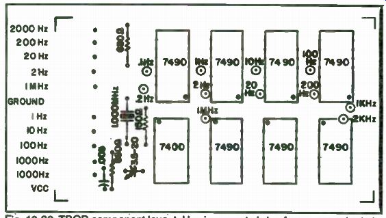 Turn the power on and check each of the DSU outputs with a scope for proper switching. A frequency of 125 Hz should be measured. If the DSU is working, turn off the power and install the DCUs. Turn on the power and check that the display reads all Os. If not, make sure all the boards are in the sockets tight or check for unsoldered connections, or bad ICs. If all Os are displayed, turn off the power. Install the Preamp board and turn the power on. The display should still read all Os. If not, the DSU may need bypass capacitors on the Vcc line on the master board. Any signal on the Vcc line greater than about 20mV will trigger the Preamp and cause false counting with no input. Any input signal will have to exceed this by at least 10 mV to be counted. If you get all Os on the display, proceed to check out the whole counter by using a signal generator to check the frequency response and sensitivity. You may want to keep a graph or record of the results for future reference. Fig. 10-43. DCU component layout. Use side mount socket for LED ( see text). One DCU uses 74LS90 for 50 HMz count speed. 6 or 8 boards per counter. Dot indicates pin 1.