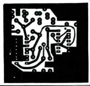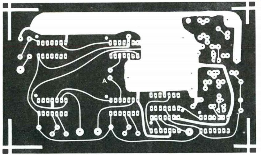 The IC's need a voltage between +5 and about +5.3 volts. While you could build a power supply, that only increases the cost. The easiest way to provide power is with four D cells or a 6-volt lantern battery, which provides + 6 volts. The 1N4001 diode, or another silicon power diode, drops this to about +5.3 volts. The scaler needs about 150 mA, so a set of four D cells will last about 10 or 20 hours with intermittent use. Figure 10-50 shows a printed circuit board layout which can be used to mount the scaler, and Fig. 10-51 shows the parts placement on the board. Leave the copper border around the board, to act as the ground connection for the board. Use phono jacks or rf connectors, and bypass the +6 volt lead. The purpose is to let rf into the box only via the input lead.