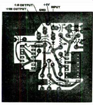 Operation. The block diagram of Fig. 10-5 shows the signal flow and control. Referring to Fig. 10-6, Q1 to Q4 shape the incoming signal to produce TTL compatible levels. A precise 100 ms gate (at IC19 pin 2) is then ored together with the signal (IC19 pin 3). This gated signal is counted down and displayed on the readouts. The trailing edge of the 100 ms gate triggers the one shot IC24. A pulse is generated that strobes the quad latches IC7 to IC12. The stored data is transferred to the decoders and readouts. The trailing edge of the one shot triggers another one shot IC25 to produce the reset pulse to counters IC13 to 18. All counters are reset to zero until the next gated input is counted. Thus the sequence is: gate, count, transfer, reset. Construction. As mentioned earlier, the heart of the counter is mounted on 3" x 5" PC boards (actually 3" x 5-3/16"). You can package these boards any way you like. Just allow sufficient ventilation in any enclosure you use. One of the drawbacks of laying out small boards is that you can't get all the circuit connections on them that you'd like. So we're going to have to add some jumpers. Refer to Figs. 10-6, through 10-8. After all the components ... are mounted, jumper IC19 pin 2 to IC24 pin 3. Also jumper point "A" to the pad right above it (for line base operation). That's all the jumping we need for the Input and Control board. The Readout board will require the following jumpers (Fig. s 10-9 through 10-11): • IC7 to 12-jumper all pins 4 and 13 (strobe). • IC13 to 18-jumper all pins 2 (reset). • IC13 to 18-jumper pins 1 and 12 on each IC only. • IC13 pin 11 to IC14 pin 14. • IC14 pin 11 to IC15 pin 14. • IC15 pin 11 to IC16 pin 14. • IC16 pin 11 to IC pin 14. • IC17 pin 11 to IC18 pin 14. Also, power to all ICs and all power grounds will have to be added. Refer to Fig. 10-9. Jumper grounds to the ground plane and between boards. Use Molex terminals to mount all ICs. The added cost is worth it. The Input and Control board artwork (Fig. 10-8) is laid out for 60 Hz operation. If you're satisfied with an accuracy of approximately 500 PPM on your counter, use it as is. You won't need the LM340-5T in the power supply, so that's an additional saving. The crystal controlled timebase should be added to get the most accuracy from your counter. Figure 10-12 is a suggested circuit. There is no artwork included for this additional circuitry. Layout is not critical and could be hand-wired in no time. If used, you won't need IC22 and IC23. To connect, remove the jumper at point "A" and connect the output on the last counter to point "A". That's about it. If you got all the jumpers in right and your power is connected right (double check), you should be finished.