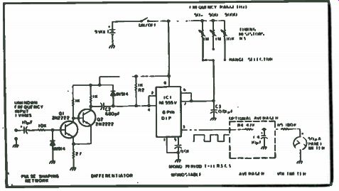 Increased Speed for the k20AW Frequency Counter This project involves the construction of a frequency counter with a low frequency (0-20 MHz) input and a divide-by- 10 prescaler capable of extending the upper frequency knit to 300 MHz. The counter is built using mostly surplus ICs and junk box parts and it works the first time you plug it in. By sorting the ICs according to speed, we were able to obtain a stable upper frequency limit of 32 MHz in the low frequency position. Much experimentation was accomplished on the front end of the counter, including the 40673, the 7413 and the 7400 input selector. Maximum attainable speed remained in the 32 to 34 MHz range. The main problem appeared to stem from the limited speed of the 7473 flip-flop which comprises the divide-by-two function of the first decade. Simultaneously with the discovery of the apparent problem with the 7473, low cost Schotty TTL ICs became available from some of the surplus companies. (They are available from Solid State Systems, P.O. Box 773, Columbia, MO 65201.) A 74S73 flip-flop was obtained and plugged into the IC5 position on the circuit board and things started to happen. Using a four turn wire loop on the counter input and a grip dip oscillator as a signal source, the counter's upper limit was found to be 62MHz! Subsequent checks proved that the initial test was not a fluke and the counter was now stable from 20 to better than 60 MHz. IC Audio Frequency Meter The 555 integrated circuit can easily be made into an inexpensive linear frequency meter covering the audio spectrum. The 555 is used in a monostable multivibrator circuit. The monostable puts out a fixed time-width pulse, which is triggered by the unknown input frequency. Referring to Fig. 10-52, transistors Q1 and Q2 are used as an input Schmitt trigger. The unknown frequency input is clipped between 9 volts and ground by these transistors. Positive feedback is used to insure the waveforms have fast, clean edges. The output of Q2 is a square pulse with the same frequency as the input signal. The output of Q2 is differentiated by C2 and R2 to provide a short pulse for the 555. A small signal diode is connected across the differentiator to insure that the 555 input never exceeds 9 volts. The 555 is connected in the standard monostable circuit. Since a Schmitt is used to trigger the monostable, square, sine and ramp type waveforms may be used at the input to the frequency meter. A nominal voltage of 1 volt rms is required to trigger the Schmitt circuit. The range scale timing resistors R3, which determine the monostable pulse-width, are small potentiometers mounted directly on the circuit board. These pots are used to calibrate each frequency scale. The output of the monostable is a fixed width pulse. Every time a zero crossing of the unknown frequency occurs, the monostable is triggered. Thus, as the frequency of the trigger pulse increases, the monostable output has a greater and greater duty cycle. The frequency limit on any one range is determined by the R3C3 time constant re-triggering, and a constant 9 volts will appear at the output. The monostable output is a pulse with a duty cycle dependent upon the input frequency. Thus, by integrating or averaging the output waveform, a DC voltage is developed. This voltage is directly related to frequency. Resistor and capacitor R4C4 is used as a pulse averager, important on the...