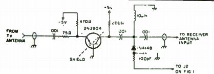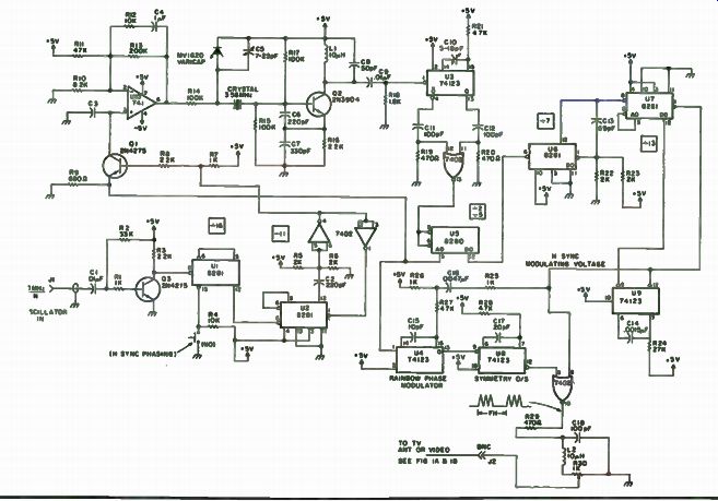 ... standard, is fed into the J1 input to Q3. The signal is divided by 16 and then by 11, for a total of 176, and drives the base of Q1, which is a phase locked loop comparator. The 741 operational amplifier (connected as an RC integrator) drives a voltage-controlled crystal oscillator operating at the color subcarrier frequency of 3.58 MHz. The other input to the comparator comes to the Q1 emitter from the loop output circuit. The output from the VXCO drives a 74123 one-shot circuit for pulse-shaping of the oscillator output. Two signals are taken from the one-shot, and the positive-going transitions are coupled through a 7402 NOR frequency doubler, the output of which is fed into the inputs of a 8280/74176. Part of this signal is divided by two and fed back to Q1 for phase lock. The result of phase lock is that you have a crystal-controlled oscillator operating at the subcarrier frequency phase locked to a local standard. This permits you to inject a signal into a television receiver and compare it to a network color subcarrier. The second part of the injected signal to the 8280/74177 binary counters is further divided by 7 and 13, providing a total ...