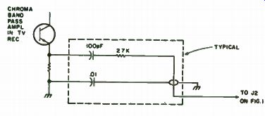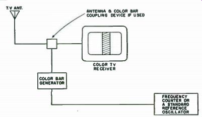 ... division of 455. The resultant frequency of 15,734,265 Hz is equal to the horizontal oscillator signal of the color TV receiver. This will produce a stationary vertical bar on the TV screen. This horizontal rate signal is used, with the output of the modulator, to drive the receiver. The block diagram of Fig. 10-61 shows the signal being interfaced through the antenna terminals of the TV receiver. Using this method requires the addition of a single transistor circuit and a pair of terminals to accept the TV antenna. This additional circuitry connects between the TV antenna and then antenna terminals on the TV receiver. See the schematic in Fig. 10-58. The second method does not require removing the antenna from the receiver and placing it onto the bar generator, but does require obtaining a schematic of the receiver so that a point in the chrominance bandpass circuit can be located. A typical chroma interface is shown in Fig. 10-59. A 15 MHz oscilloscope will be helpful in determining that all of the ICs are operating and dividing properly. There is only one circuit in the unit that requires tuning, and that is the 3.58 MH crystal stage; C10 requires adjusting to produce doubling of the frequency at pin 13 of the 7402 IC. Check pins 4 and 13 of U3 for equal amplitude signal. Now connect the color bar generator to the TV set, tune in a color program, preferably a network program but not absolutely necessarily at this point and adjust the level control RI for an acceptable presentation of the vertical rainbow color bar on the screen. Adjust the 7-25 pF C 1 crystal trimmer capacitor until the movement of the bar slows sufficiently. This will place the crystal frequency so that it is within range of the 741 op amp voltage swing and so that the varicap can lock the crystal on frequency when the local frequency standard approaches phase resonance. A VTVM at pin 6 of the 741 op amp is another good test point. Variations of C1 will cause changes at pin 6. When everything is working properly, the device for calibrating the frequency standard is ready to be used. Everything is now ready for that very exciting moment, except for an extended period of warm-up time for the local standard. This period depends upon how accurate a calibration one is looking for. Obviously, if you are seeking the ultimate, then it is recommended that the oscillator, once turned on, remain on indefinitely. For a starter, I would suggest a 24-hour warm-up be considered as minimum. Then start a program of measuring the frequency every 24 hours, preferably at the same time each day. The stability will be erratic for about a week. If a careful record is kept, you will note that this stability will improve over the next 90 days, when it will settle out with a predictable aging rate thereafter. So there is no misconception at this point, it should be understood that, if the standard oscillator is one of mediocre quality (has no oven, not a low drift crystal cut, etc.), then one cannot expect accuracy of better than perhaps parts in 1.0-7 or worse. In this case, the unit should be warmed up for a period of five to 24 hours, calibrated as best you can, and used as soon thereafter as possible. If the crystal has an oven, the expected accuracy will be better. The quality of the crystal and the oven are of major consideration. -- Next: Oscilloscopes