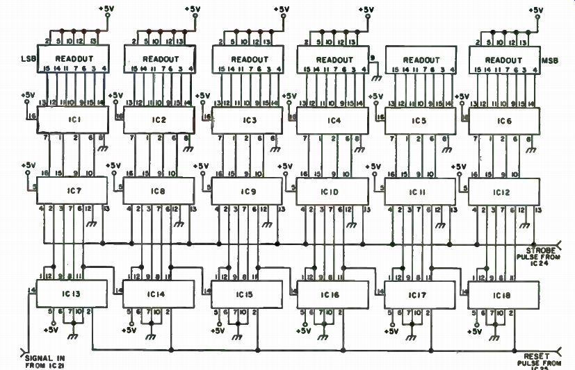 ...can act as a waveform averager. Input frequencies greater than 50 Hz will be averaged by the meter fairly well; however, at lower frequencies the meter will respond to each cycle of the unknown frequency input. The meter is used as a high impedance voltmeter. A 1 mA meter could be substituted with a change of resistor R5. For a 1 mA meter, R5 should be about 9.1k and R4C4 should be changed appropriately. R4 should be a factor of 10 less than R5, and the same R4C4 time constant should be kept. This would make C4 a very large value, so R4C4 could be left out if the lower frequencies are of little interest (less than 50 Hz). The range scales are set up in decades. To calibrate each scale, a standard input frequency is connected to the input. About 1 volt rms is needed to trigger the first stage. The monostable must be less than the maximum input frequency to be measured on each scale. With the maximum input frequency applied, each range potentiometer should be adjusted until the value of the input frequency corresponds to the full scale meter reading. The duty cycle of the monostable should be roughly 90 percent at the maximum frequency input for each scale setting. If, for a 90 percent duty cycle, the meter will not read full scale, meter resistor R5 should be lowered accordingly. Each scale setting should be calibrated by adjusting the respective R3 potentiometer. During operation, when the scale reads off scale on any range, the scale should be changed to the next higher setting. Once calibrated, this frequency meter should read within 5 percent of full scale. The useful frequency range of the meter is from tens of Hertz to well over 50 kHz. Although decade ranges are shown, the ranges between the decades can easily be added to give as many frequency ranges as deemed necessary. The Speedy Audio Counter he need for fast and accurate measurement of the low frequency tones in an electronic organ provided the basic drive to produce this counter (Figs. 10-53 through 10-55). An earlier version was slightly less costly, but far too slow and lacked the needed resolution. This design works well, and should find acceptance with those wishing for precise measurements for most audio frequency applications. Most electronic organs contain a master oscillator board that uses 12 slug-tuned coils for generating the highest tones, or the top octave. These are followed by a divider chain that provides successively lower octaves. It was decided to measure one of the lower octave ranges that spans from C6 ...