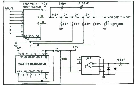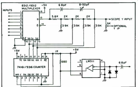 ... voltmeter to measure the calibrate signal at C. Set the voltmeter to read "DC volts," and adjust the 10k pot until the meter reads exactly one-half volt (0.5 V). What you have done here is used the DC voltmeter to measure the average output voltage, and, since the signal is switching back and forth between 0 volts and 1 volt, the average value you read on the meter is 0.5 volts. This is true only for a symmetrical square wave, of course, and the component values in this circuit have been chosen such that any error in symmetry is less than 1 percent at 1000 Hz. You also have to be assured that the negative (low) half cycle of the signal is actually at zero volts, which it is, for all practical purposes, when the 555 is operated at the 5v input voltage supplied by the 7805 regulator. The easiest way to set the frequency is to measure the calibrate signal with a digital counter. If you don't have access to one, an accurate audio signal generator can be used, with the calibrate signal frequency being adjusted to match the known signal while they are being watched on the scope. In any case, the frequency of the calibrate signal is adjusted with the 50k pot. If you prefer a frequency other than 1000 Hz, you can set the pot for a lower frequency without hurting anything. If you set the pot to a higher frequency, though, the symmetry of the waveform will be upset. To go to a higher frequency, you should lower the value of the 0.027 capacitor instead, using the formula: C = 28/F, where C is the value in microfarads of the new capacitor, and F is the desired signal frequency. Summary. This is one of those satisfying projects that you can put together in an hour or so, at a cost of only $2 or $3 and see the results immediately. It consists of only seven components, which are available from any retail or mail-order electronics dealer. It's a handy little device that will enhance the utility of lower cost oscilloscopes and you can sit back and enjoy using it for years to come. Eight Trace Scope Adapter Probably the most frustrating problem faced when designing digital circuitry is control of timing. After working out a design on paper, one usually breadboards the circuit to prove it out. In accordance with Murphy's well-known laws, there will be several logic errors which will then be apparent but very elusive. Depending upon the complexity of the design, the errors may be (but usually are not) easily located and corrected. A number of tools are helpful in tracking down these problems-the logic probe and oscilloscope probably being the most helpful. A logic probe establishes the steady-state status of various points in the circuit, but tells nothing about pulse widths or repetition rates. The oscilloscope is used to visually illustrate these waveshapes, pulse widths and repetition rates. What most scopes do not show is the time relationship between pulses at different locations in the circuit. Sometimes this relationship is crucial in searching out a problem that may be caused by glitches ( extremely short pulses caused by unexpected and unwanted time overlaps). Well-equipped laboratories use special multichannel logic scopes for this sort of work, but most of us are not equipped with the kilo-buck pocketbook required to manage this. Even a dual channel high speed scope requires a considerable investment. While such a scope would be most welcome in any experimenter's laboratory, most of us must settle for a relatively inexpensive general purpose scope. Fortunately, it is neither difficult nor expensive to build an adapter to display multichannel logic signals. The adapter permits viewing up to eight channels of logic signals simultaneously, and thereby examination of the relative timing between them. Although analog waveshapes cannot be ...