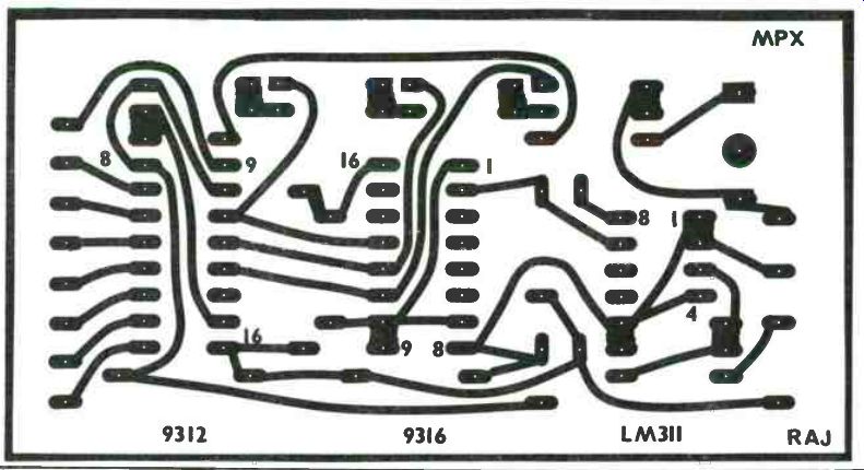 ... displayed (you can use your scope without the adapter for this function), it will show the low or high states, in precise time positions, of any signals present in TTL or DTL circuits. Almost any general purpose scope should work with this adapter, but it is recommended that it be equipped with a triggered sweep. The viewing of simple repetitive signals without a triggered sweep can be frustrating enough, but attempting to lock onto one of eight channels being displayed may be virtually impossible. If you are using a scope without this feature, consider adding a new triggered sweep, even if you do not build this adapter. Scope bandwidth is not critical unless you are working with really high speed stuff, and a 4 MHz bandwidth will let you examine almost all you need to see. You must have a way to externally trigger the scope sweep, and you will have to find the sweep signal or blanking pulse to permit changing the input channels during the retrace interval. The circuit itself is very simple. A small capacitor couples the scope sweep circuit to a voltage comparator (you may find it necessary to adjust the size of the capacitor for reliable trace switching). The sweep retrace causes a negative excursion at pin 3 of the LM311, forcing its output to go high. Each time this occurs, a 16 stage counter advances one count. Three output bits of the counter are connected to an eight-to-one 9312 multiplexer, which selects each input in turn and outputs to pin 15. If most of your work is at the lower frequencies, use the low order 3 bits of the counter, instead of the 3 high order bits (Fig. 11-6). When using the 3 high order bits, you may use the adapter with a fuel channel scope operating in the alternate mode. A ladder network commonly used for digital to analog conversion is used to position each channel on the screen. The resistors should be well matched (i.e., 1 percent), but satisfactory results have been experienced with 5 percent units. If your display is not evenly spaced vertically, try swapping resistors in this network for best spacing. The variable capacitor is used to compensate for the scope input capacitance, and should be adjusted for best waveshapes. The output potentiometer will not be required in most instances, and should not be used unless essential. Note in Fig. 11-6 that a 74161 or 9316 synchronous counter is recom mended, rather than a 7493 or similar asynchronous type. It is unlikely that propagation delays in an asynchronous counter would result in viewable glitches on the scope in this application, but it is good design practice to always use a synchronous counter where the output states are decoded and fed back to the counter. The adapter may be built on a small printed circuit board (Fig. 11-7) and installed inside your scope. However, it may be very conveniently enclosed in a small box which can be located near and powered from the digital project, and coupled to the scope via cables. You will need the usual vertical input cable and a sweep-out signal. Many scopes have an Ext jack for horizontal input, which is permanently connected to the input of the horizontal amplifier. When the sweep is running, this also happens to be the output of the sweep generator. Should you experience difficulty in obtaining a stable trace, the sweep circuit may not be advancing the counter properly. Try a different spot in the sweep circuit first. You may find it necessary to invert the signal by using pin 2 of the LM311 (grounding pin 3) if the signal is reversed in polarity. The 74161 counts on a rising edge, and reverse polarity will cause the channel change to occur in mid-sweep, with obvious visible distortion. You may find experimenting with the size of the sweep input capacitor to be helpful, but be careful to avoid distorting the sweep. The scope will not be as bright as usual, as the trace is being timeshared among 8 signals. A slight adjustment of the brightness control compensates for this. The variable capacitor is adjusted for best waveform using a 10 kHz or higher digital pulse. A 74151 ...