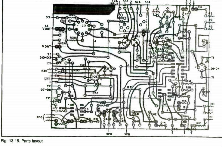 The Voltage Regulators. The 419TK regulator is readily available. It is internally current limited at about 350 mA when the positive output is shorted to ground. It also has internal thermal limiting that will reduce the output when it gets too hot. A small heat sink is required when the operating current is 100 mA in each leg of the output. In Fig. 13-11, S3 is normally open. When S3 is closed, R27 can be adjusted to give + 12, - 6 volts output for the operation of certain types of voltage comparators. The 309K also has current limiting and thermal limiting. It will provide a little over 1 ampere when mounted on a heat sink with the circuit shown. The TVR2000 has been available from Poly Paks for a number of years and is quite inexpensive. In Fig. 13-12, a foldback current limiting option is not used. Instead, simple short circuit sensing is used. R37 and R38 set the short circuit current to a value of about 1.2 amperes. The relationship here is Rsc 1 out --- 0.1 volt, where R37 and R38 in parallel make up R.c. R39 sets the output voltage. Q3 acts as a current booster and is mounted on a heat sink. C10 stabilizes the current limiting circuitry and C11 stabilizes the regulator section of IC5. Different values from those shown may be required to drive high capacitance loads. Selecting Resistors. Resistors of 1 percent tolerance are best for R1, R3, R5 to R8, R10 and R12 to R14. This will make the final adjustments simpler and will keep tracking errors in R4 and R9 to a minimum. In Fig. 13-12, 5 percent resistors will suffice for R32, R34, R35 and R36, providing you choose them such that R32 R34 and R36 Regarding the tracking of R4 and R9 -since they form a tandem control, it is important that they both exhibit approximately the same resistance between their wipers and their ends for all rotations of the shaft. Failure to do so will mean that the positive will trip at different currents. If you want very good tracking, replace both R4 and R9 with a series of 5 percent resistors and use a two pole rotary switch to select the current limit you want as shown in Fig. 13-14. Construction. All three supplies were constructed on a single 4" x 5" printed circuit board as shown in Figs. 13-15 and 13-16. IC3 does not plug directly into the board. The holes in the board have been spaced out to assure clean etching. Solder a short wire to the outside of each pin of IC3.