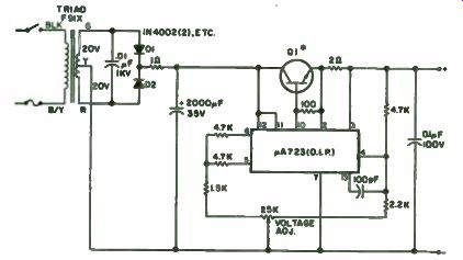 For all its use of inexpensive or available parts, this regulated supply has more than proven itself on the bench. The 2-volt lower limit allows even RTL and low-voltage CMOS logic to be operated from the supply, and the 20-volt maximum output voltage allows for most other logic and linear IC circuits. Adjustable Bench Supply How about constructing an adjustable voltage power supply that can have up to 1.5 amperes output with good load voltage regulation and full overload protection at minimal cost? Admittedly, a $5 estimate depends a lot on what parts are available from one's junk box, but for just a few dollars spent on a new IC, one can have the "heart" of a very versatile power supply. The new IC is the LM317 by National Semiconductor. This IC promises to be as famous as the LM309, which is universally used in power supplies for digital circuitry.