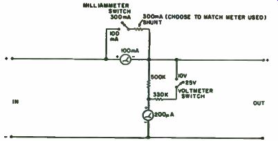Surprisingly Low-Cost Lab Supply The µA723, as first introduced by Fairchild, is one of the oldest and most accepted regulator ICs in the industry. The µA723 is second-sourced by almost every linear IC house in the U.S. and still enjoys enormous usage. Thus, this IC has become about as inexpensive as a linear IC can be. The µA723 equivalent circuit is shown in Fig. 13-1. Because \ref (the internal reference voltage) is about 7 volts, the µA723 is usually configured in one of two basic circuits-one for output voltages below 7 volts and the other for output voltages above 7 volts. These basic circuits are shown in Fig. 13-2. The usual external current increasing transistors are not shown here, in order to keep the circuits simple. One of the linear IC houses which makes the equivalent of the µA723, Teledyne, has published an application note in which is shown a novel circuit that allows output voltages above and below 7 volts. That basic circuit is shown in Fig. 13-3. This circuit has in it a correction that was made from the original (which would have prevented the current limit from functioning). A complete lab-regulated supply providing 2 to 20 volts DC with current limiting at 300 mA is shown in Fig. 13-4, with an NPN power transistor to increase current capability. The IC pin connections in Fig. 13-4 are for the dual inline package version of the µA 723 only; the "TO-5 can" packaged 723 would work as well, but pin numbers would have to be changed. The rectifier-filter section utilizes a Triad F91X transformer and a full-wave rectifier with capacitor input. The rectifier diodes are Motorola HEP R0051s, but almost any two 1 amp silicon rectifier diodes ( 1N4002s, for instance) could also be used. Q1 is a Motorola HEP S5000, but it has several equivalents-RCA SK3041, Sylvania ECG152 or 2N5191. All the parts are board mounted, with the exception of the transformer, filter capacitor and 25k voltage-control pot. In off-board mounting of the 25k pot (say on the front panel of one's own power supply cabinet), the lead lengths of the wires to the pot should be minimized. It is intended that the AC switch, fuse holder, meters (if used) and binding posts also be mounted on the cabinet housing the circuit board. LMB and Bud each have a line of small box cabinets that would be suitable for making a finished bench supply using this circuit. The choice of which particular cabinet will usually be dictated by the meters one has on hand, because the circuit board is only 2" x 2 1/2 ". An LMB W1N box cabinet ( 10" x 4" x 3 1/2 ") was used for the metering circuit shown in Fig. 13-5. Only meters that were on hand were used.