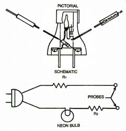 Commercial FM Receiver. If your radio has FM, it can be modified to make a receiver that will pick up commercial business-band FM signals such as police, fire, public service, weather, etc. Some find die idea of listening to these signals more appealing than music when th t radio is resting on the bench. Begin the modification by changing the oscillator coil. Reduce the number of turns by 1/2 , then bring it on frequency by adjusting the spacing of the turns and the trimmer capacitor on the radio. If you can't measure the oscillator frequency with a grid-dip meter or equivalent, use a TV tuned to channel 7. Watch the TV as you tune the oscillator; when you can see and hear a signal on the TV, the oscillator is set around 175 MHz. The radio will now tune around 185 MHz or 165 MHz, depending on the resonant frequency of the circuits in the rf amp and mixer stages. Reduce the number of turns in the rf stage and the mixer by the same factor as the oscillator coil. Tune them in by adjusting the spacing and by resetting the trimmers on the tuning capacitor. Final tuneup should come while listening to a signal. Now that the radio is completely modified, it will serve you well as a radio as well as a handy test jig ideal for servicing transistor radios. The unit is also perfect for the experimenter who may need to use one or all of its functions in checking out breadboard circuits. Once you master the use of all its possibilities, it will prove as handy on your bench as your VOM. World's Smallest Continuity Tester Using a rubber-type two-pronged plug, the few components that make up this tester are mounted inside the plug (Fig. 2-10). The hole in the end of the plug through which the cord enters is used for the NE-2 neon bulb. Two small holes opposite each other are made near the base of the plug for the probe wires to extend, and the two 100k, 1/2 watt resistors within the ...