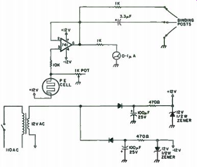 ... plug cavity, being in series with the probe cords, prevent shock. A piece of W' j. d. aluminum tubing 1/2 " long, placed over the bulb end of the plug, with a 5/8” o. d. clear plastic lens pressed into the tube, protects the bulb and enhances the appearance of the miniscule tester. Make the probe wires long enough to suit your needs. Photo Electric Bench Accessory Combine the leftover power supply from an experiment that failed with some 12 for a dollar CdS photocells purchased from S.D. Sales. Mix well with a lull in regular hobbyist activities and the result is an interesting unit with many uses. The diagram in Fig. 2-11 shows the basic unit. The photocell is in series with a pot. There is a voltage applied across this series combination to ground. The op amp is used as nothing more than a high impedance driver for the one milimeter used as an indicator of relative light flux impinging on the cell. The word "relative" is important to note, as the meter is not calibrated in any special units. Its reading is comparative only and its function is to tell you that light has either increased or decreased at any specific moment. The ...