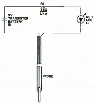 ...speaker. Solder another piece of insulated wire to the point on the circuit board where the free end of the diode used to be. The other end of this wire is connected to the remaining pin on the earphone jack that used to be connected to the innards. Now, without a plug in the earphone jack, the pocket radio will play normally since the diode detector is connected to the volume control once again, although now through the contacts of the earphone jack (Fig. 2-15). • For the third step, cut the earpiece off the end of its cord. Strip the ends of the wires, and with an ohmmeter or continuity checker, find out which of the wires goes to the inner pin of the jack and mark it. The other lead is the ground connection which can be connected to an alligator clip. Solder one lead of a 1 uF capacitor to the "hot" lead. This capacitor will keep stray DC voltages out of your pocket radio, thus preventing premature trauma. The free end of the capacitor is the probe tip, and is to be connected to the equipment under test, wherever you suspect audio should be. With the earphone plug inserted in the jack, and the probe connected to the circuit under test, you should now hear the desired signal, rather than Olivia Newton-John. The lead with the capacitor can be built into the plastic end of a discarded ballpoint pen, to make a neater probe tip. The voltage rating of this capacitor must be higher than any voltage you have in the equipment under test. For tube type receivers, 600 volts is usually adequate, while a 50 volt capacitor is adequate for transistor receivers and hi-fi gear. If you're going to run the pocket radio from its own battery, this step may be omitted. If you would like to run the pocket radio from the voltage in the gear under test, this formula can be used to find the right value of dropping resistor: Resistance= (Available Voltage) - (Voltage Needed) Receiver Current For example, if your pocket radio needs 9v to operate, and 12v is available, and the pocket radio draws an average of about . 010a, then by plugging the numbers in: 12-9 / 0.01 = 3 / 0.01 = = 300 ohm resistance needed The wattage needed for the resistor can be figured by the formula I^2 R = P; that is, the current multiplied by itself, times the resistance, gives the needed power rating in watts. In this example, it would be (0.1) x (. 01) x 300 = 0.03 watts. A 1/4 watt resistor would give a more than adequate safety margin. If you're planning to use a 150v supply to run the pocket radio, a 14.1 k-O at 1.4 watts is the calculated value, and 15k-ohm at 5 watts is adequate and a practical common value. This resistor is connected between the positive terminal of the battery holder and the supply voltage point, as shown in Fig. 2-16. Fig. 2-16. Battery terminals with added dropping resistor. Once completed, the pocket radio can be. used normally. By just plugging in the earphone plug/test probe, it becomes a signal tracer or audio amplifier. Total cost is less than 50 cents and you've still got your radio. Test Instrument Saver Delicate, costly test instruments may suffer severe damage when their conventional, too long leads snag on tools or on components spread out on the workbench and are inadvertently yanked off it to the floor. A partial cure for this hazard is to replace the long leads with the much shorter coiled leads commonly used on cameras and flash units. The coiled leads can be stretched out to where needed. When let go they retract out of harm's way. Should they lose their recoil power, rewinding the coils in the opposite direction helps restore their springiness. Since each lead has two wires, their extra continuity gives them longer life. The Violet and Other Houseplants Tester The device we are about to describe might be classified as a "one evening kit" and does just as the title says-it tests violets. Not only does it test violets, but other miscellaneous houseplants as well. This gadget detects the presence (or absence) of moisture and informs people when it is time to water their plants. The violet tester does not require exotic memory ICs, clock chips or printed circuit boards. One LED (garden variety), a single 330 ohm resistor and a 9 volt transistor radio battery are all the parts needed for the heart of the device. The testing probe, case, etc., may be constructed of miscellaneous junk that you have accumulated. If you will notice Fig. 2-17 the 9 volt transistor radio battery is in series with the 330 ohm resistor and LED indicator. The 330 ohm resistor limits the current to the LED. Without the current limiting resistor, the LED would draw excess current and soon destroy itself. Also in series with this are test probes. These probes, when inserted in the soil, will provide a current flow or complete the series circuit if moisture is present. The amount of moisture and mineral content of the soil will determine the current available to light the LED. Therefore, when adequate moisture is present, the LED will come up to near full brilliance. Varying lesser degrees of illumination will indicate less moisture. At this point may we indicate that the violet tester is not a laboratory standard-it is merely a gadget in indicate relative moisture, and at that, serves its function well. What we are trying to say is-if some plant suddenly shrivels up, it is not the fault of the violet tester. On the other hand, if the vegetation involved suddenly tries to molest you some evening due to its fantastic state of health, it also is not the fault of the tester. Anyway the device has proved to be much more sensitive than we had expected prior to construction. Common LEDs seem to be very responsive to minute current changes. The moisture probe does not have to be a single chunk of copper tubing such as we have used. A pair of separate probes spaced 1" will work equally as well. The only requirement is that they be rigid enough to penetrate the soil.