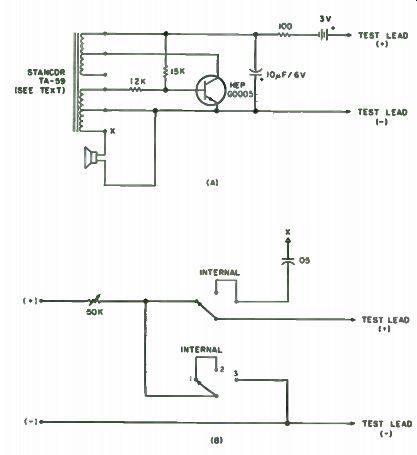 ...resistance. With usage, one can become familiar with the sound of at least the major steps in the output pitch, such as for resistance values of 1k and 50k. By adding a few more components to the basic circuit, as shown in Fig. 2-19 B, more versatility can be gained from the unit. The addition of a series 50k potentiometer allows one to control the volume and also to limit the short circuit output current to less than 60 uA. The latter is useful as a safety feature, when testing some semiconductor devices, when one is unsure of the terminal markings. In the center position of the switch shown, the battery line is left floating and the positive test lead is connected to the speaker over a 0.05 uF capacitor. The speaker can then function as a replacement test speaker or as a dynamic microphone replacement. The reproduction quality is good enough to at least determine whether or not the speaker or microphone substituted for is basically defective. In the right hand position of the switch, the battery circuit is completed to ground, and the internal speaker output remains connected to the positive test lead. In this mode, the circuit functions as an injection oscillator, the level of which can be controlled by the 50k potentiometer and monitored on the internal speaker. The output is quite harmonically rich, and it can be used to check amplifiers all the way from the audio range to the HF range. One switch that could be used is a special miniature DPDT toggle switch with a center position. But, in the center position, instead of the usual "off' position, the poles still remain connected to opposite side terminals of the switch. The switch is available for $1 from Tri-Tek, 6522 North 43rd Ave., Glendale AZ 85301. The switch can, of course, be replaced by a regular 2P3T rotary switch, but then requires a larger enclosure. Using the miniature toggle and with the basic circuit wired on perfboard, the unit is assembled in a 3 1/4" x 2 1/8 x 1 5/8” Bakelite box, complete with batteries. Probably some more uses can be found for the circuit, with a bit of imagination and a modified switching scheme. For instance, it would seem possible to rearrange things so that the circuit could also function as either a preamplifier or a low level audio amplifier complete with speaker. All in all, it is hard to find a more handy unit for general circuit or equipment checking, before one resorts to proper instruments for specific checks. -- Next: Voltmeters and Ammeters