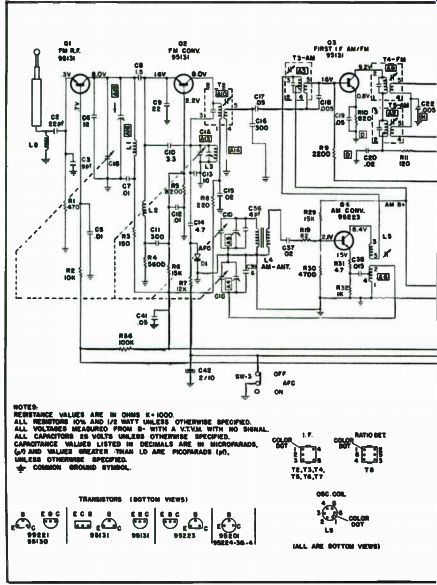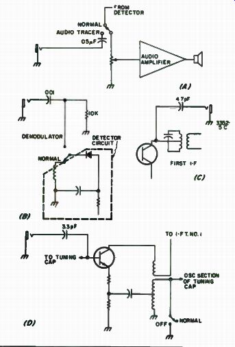 NOTES, RESISTANCE VALUES ARE IN OHMS 11.1000 ALL RESISTORS. AND 1/2 WATT UNLESS OTHERWISE SPECIFIED. ALL VOLTA«. MEASURED FROM 5- WITH A V.T.V.M. WITH NO SIGNAL. ALL CAPACITORS 25 VOLTS UNLESS OTHERWISE SPECIFIED. COLOR CAPACITANCE VALUES LISTED IN DECIMALS ARE IN MICROFXRADS, 50T le AND VALUES GREATER .TNAN 1.0 ARE PICOFARAOS UNLESS OTHERWISE SPECTRA. COMMON (ROUND SIMIOS.. ---------------------------- Signal Tracer. The radio will work as several different tracers. The most obvious use is shown in Fig. 2-5A, an audio signal tracer. Injecting a signal at the detector as shown in Fig. 2-5B yields an rf demodulator tracer. If you inject a signal into the i-f as shown in Fig. 2-5C, you have a 455 kHz tuned tracer (or 10.7 MHz if the radio has FM) for use with standard i-fs. If you allow disabling the oscillator as in Fig. 2-5D, you can inject another radio's oscillator signal to test the oscillator section of the other radio. Just inject the local oscillator from the radio being serviced, juggle the dial on both radios, and if you can pick up signals, the oscillator in the other radio is working. The same method could be used for FM systems. In that case, couple the oscillator signal to the FM converter stage through a gimmick of about seven twists of hook-up wire connected in the same place on the FM converter stage. You will have to add a switch to disable the oscillator as
