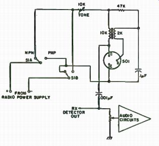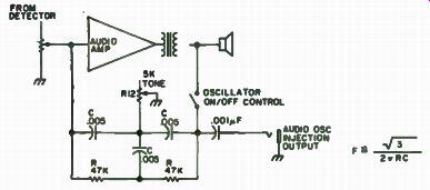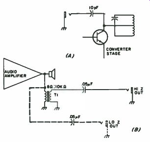 Signal Injector. The output of the converter taken from the point shown in Fig. 2-6A provides a 455 kHz signal for checking the i-f of a radio. An equivalent point on the FM converter provides 10.7 MHz signals. Tune the radio to a station and the 455 kHz output will be the signal transmitted from that station. Figure 2-6B shows the connection for injecting audio signals; just tune in a station and use its audio to check out the audio circuits under test. Alignment Generator. In Fig. 2-7 the output from the i-f is taken after it has gone through several stages of i-f amplification. Since this signal has the benefit of the several stages of selectivity, the i-f output signal can be used as a source of accurate 455 kHz (or 10.7 MHz) assuming the radio has been accurately aligned. Merely align the radio as one of the steps to making it into a piece of test equipment. Signals tuned in on the radio will be translated to their equivalent i-f frequency and can be used as alignment signals. Transistor Checker. Figure 2-8 shows an outboard circuit added to the radio to allow in or out of circuit transistor checking. If the transistor under test will oscillate, it is generally good. This is a fairly accurate check in or out of circuit. Another simpler tester can be fabricated by merely replacing one of the transistors in the radio with a socket. When a transistor close to the type you are replacing it with is put in the socket, the radio should work. This test is only accurate for the NPN or PNP transistor type being replaced, and ...