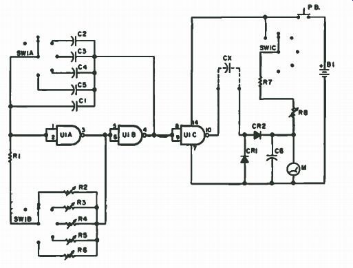 AMAZON multi-meters discounts --- AMAZON oscilloscope discounts Build a Simple Capacitance Meter A time-honored and very practical supplier of components for the latest experimenter's project continues to be the junk box. A well-stocked junk box not only reduces the cash outlay of a project, but also serves as a source of comfort and inspiration to the happy owner. A major factor limiting the utility of these readily available goodies is the difficulty of identifying them properly. The number of books describing transistor checkers, IC probes and programs for identifying and checking ICs points not only to the popularity of the junk box source of supply, but also to the difficulty mentioned above. Capacitors are a part of this problem. It seems that the original equipment manufacturers, the source of many of these components, delight in concealing the true value with an esoteric part number. Cheer up! All is not lost. This is an unbelievably uncomplicated and cheap device that will go far toward blowing the cover of all those mysterious micas, discs and ceramics smirking at you from your hoard. The Circuit. This little device is ridiculously simple and inexpensive. It consists of an oscillator and a rectifier, with a meter to indicate the value of the rectified current. Let's refer to Fig. 4-1 and be a bit more specific. U1A and U1B are two NAND gates of a CMOS quad two-input NAND gate. You can get one for $ 0.29 if you don't have one. These two gates are cascaded, biased in the linear mode by the resistor network and caused to oscillate by capacitive feedback around the two gates. The output is a square wave which is buffered by the third gate U1C to insure an output of constant amplitude. We apply the output of the buffer to the diode rectifier through our unknown capacitor. If the unknown capacitor is small (has high reactance) in comparison with the frequency of the oscillator, it will pass a small pulse on each cycle which will be rectified by the diodes. The meter will read the sum, or integral, of these pulses. The larger the value of the capacitor, the larger the pulses, the greater the sum and the higher the meter reading. Simple, isn't it? This is a basic counter circuit. With a given value of capacitor, if the oscillator frequency is increased, there will be more pulses per second, thus a higher integrated meter reading. This forms the basis for a very simple and useful counter which is linear over quite a few octaves. We are simply turning the circuit around to measure capacity instead of frequency.