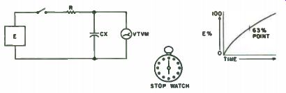 ... actual value. If extension leads of more than 2" are required, the same procedure should also be used on the x10 ( 10-100 pF) scale. A Digital Capacity Meter Simple Construction Project There are many means of taking the measure of a capacitor. For the range of capacitors that the instrument to be described can handle (approximately one microfarad to 99,900 microfarads), the best method to refer to is time versus voltage. Mother Nature and science reached a detente relating the charge or discharge to reach some specific limit. The charge limit reaches 63 percent of the applied voltage in RC seconds, where R is in megohms and C is in microfarads. Thus, if you were to apply exactly 10 volts to a capacitor which you made sure was totally discharged, through a resistor of 1 megohm, and you monitored the voltage rise across the capacitor with a voltmeter that did not load down the circuit, you could use a stopwatch to time the number of seconds it took for the voltage to hit 63 percent of 10 volts, or 6.3 volts. It is easy to see that a 1-microfarad capacitor would time out at 1 second and that a 100-microfarad condenser would time out at 100 seconds. You could work the same general method using the discharge curve, but your point of measurement would be when the voltage had fallen 37 percent from a fully charged capacitor. Herein lies the rub, for it is much harder