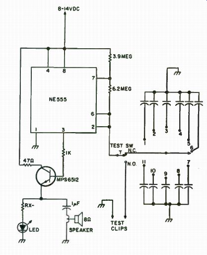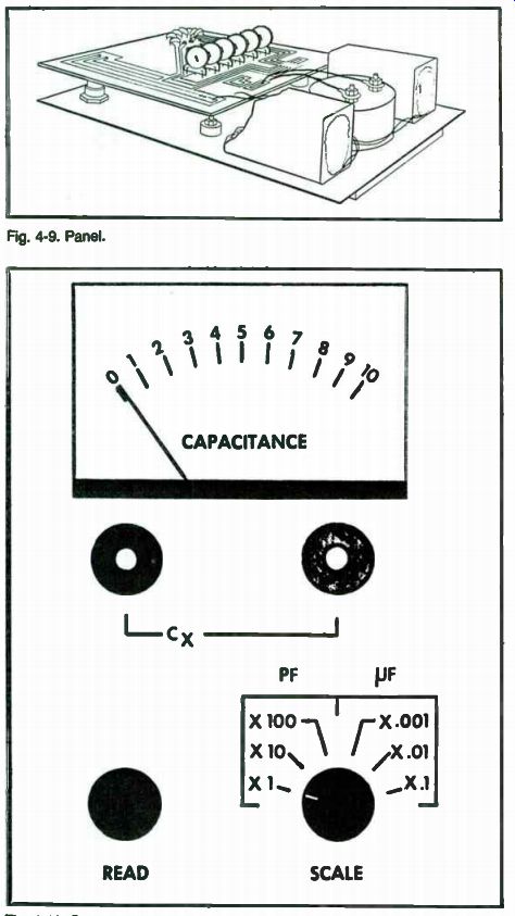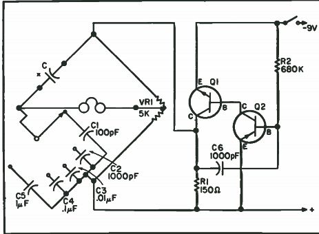 The circuit of the result is shown in Fig. 4-14. Despite its simplicity it works nicely for values from 25 pF to 10 uF. Q1 and Q2 are combined to form an audio oscillator, output from Q1 being applied across the bridge. The bridge has five capacitors for five ranges. Cx is the unknown capacitor. VR1 is a linear pot (it must be linear) for balancing, and high resistance phones indicate the null, so that the capacitor value can be read from the setting of VR1. Oscillator. Assembly details will probably not matter much, but the audio oscillator can be wired on a tag strip. Both the transistors are audio or small output types, such as are available in great number and it is difficult to find two transistors which will not work here. Q1 must, however, be NPN, while Q2 is a PNP type. A quite high tone is best. If necessary juggle with C6 or R2 or both to obtain this. The supply need not be 9v. The phones put across R1 will show how this works and two flying leads are soldered on to go to the bridge part of the unit. Bridge. The five-way switch selects any capacitor C1 to C5. Without using the extreme settings of VR1, where accuracy falls, the center setting of VR1 is obtained when Cx is the same as Cl, C2 or so on. As an example, if C3, 0.01 uF is in circuit, the middle setting of VR1 balances the bridge at 0.01 uF for Cx. From here, the swing of VR1 goes from 1/10 to 10 times, so that this range is 0.001 uF to 0.1 uF. In the same way, C2 ( 1000 pF) gives a range of 100-10,000 pF, while C4 gives 0.01-1 uF and C5 gives 0.1-10 uF. C1 would by the same token provide 10-1000 pF, but the null or balancing point for VR1, easily audible with larger values, grows a little difficult to hear at the extreme low capacitance end of this scale. It will be seen that the overlap is such that the same total coverage would be achieved with only Cl, C3 and C5. These three ranges would be 10-1000 pF, 0.001-0.1 uF and 0.1-10 uF. However, the extra capacitors C2 and C4 are well worthwhile to fill in for easy checking. C 1 and C2 should be silver mica 1 percent items. For C3, a 2 percent or 5 percent item will probably have to be adopted. C4 may be difficult to get with better accuracy than 10 percent, unless costly, while C5 is actually two 0.5 uF tubulars in parallel. This means that calibration can be accurate for the lower values, but is less so for high values. In any case much accuracy is often not necessary with large values, except possibly in audio filters and some other applications. These items are grouped mainly around the switch and the layout shown (Fig. 4-14) allows convenient wiring with the capacitors supported by a near tag of the audio oscillator section. Case. A plastic box about 6" x 4" x 2" with insulated panel is most suitable. It carries an outlet for the phones, on-off switch, two terminals for Cx and a bracket to clamp the battery in position. The scale for VR1 is marked 100 pF to 10k pF for C2 range and 0.01 uF to 1 uF for C4 range. The switch is marked pF and uF for direct reading of these ranges, and for uF x 10, uF 10 and pF 10 for the other ranges. Calibration is carried out on the C2 range, with several known capacitors, preferably 1 percent, such as 100 pF, 250 pF, 500 pF and a few others. Values can be obtained by paralleling some, such as 250 and 100 for 350 pF, while switching to C 1 range allows the 100 pF, 250 pF and other low values to be used again for what will be 1000 pF, 2500 pF and similar 10x values on the C2 range. No calibration is made for the large capacitor ranges, as these will be progressively 10x the existing ranges (assuming C3, C4 and C5 are accurate enough). A clip or two on short leads from the terminals will be handy for some capacitors. Simply rotate VR1 for the null and read the value on the scale. High impedance phones, in the 2k to 4k range, will be best. A dip but no real null shows leakage and is to be expected with electrolytic capacitors. The Capacitor Comparator If your junk box is tucked way back in the corner in a spot where you throw all those unmarked, unidentified capacitors that you just KNOW will come in handy some day, then this project is for you. Round ones, square ones, flat ones, fat ones, piston and bypass ones and those a guy could have a great time screw-drivering if he just knew where to use them are probably all in your box.