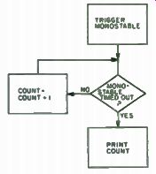 This simple circuit is an easy one-evening project that when completed will provide an audio tone comparison of a built-in reference capacitor to an unknown capacitor connected to the test clips. Bearing in mind that the larger the capacitor the lower the tone, it is a simple matter to establish the value of unmarked units. The circuit (Fig. 4-15) will identify caps between . 5 pF and . 001 uF by providing tones between 8 kHz and 100 Hz. The heart of the tester is a 555 timing IC and may be operated from any DC voltage source between 8 and 14 volts. An LED indicator is provided for testing values larger than . 001 uF which do not produce a tone but merely turn the LED off and on. A.1 uF unit will trigger the indicator at approximately 5 Hz. Piston, compression and rotary trimmers may be identified by first making a comparison fully closed and then fully opened. Small gimmick caps made from twisted leads are also easily sized. The LED is, of course, optional, as well as the number of reference capacitors. Any NPN switching or audio transistor may be used in place of the MPS6512. If the LED is not needed, the transistor may be eliminated and the speaker with its 1 . uF coupling capacitor is connected directly to pin 3 of the IC. Why not try a Poly Paks unmarked assortment at 100 caps for $1.98? Computerized Capacity Meter Caught up in the hacker frenzy while attempting the design of some higher-order active filters? If you have ever spent more than a few hours programming an SR-52 to solve cubic and quartic equations, you have realized that some heavier-duty number-crunching was called for if you really wanted to obtain those steep skirts. If you head to your local friendly computer store, you will return several hours later with several heavy boxes and one extremely light wallet. The kits will go together surprisingly well and produced only a couple of minor bugs.' You may now also need several close-tolerance capacitors. But if you do not have any kind of a bridge for measurement and if the state of your wallet precludes the purchase of such an instrument (or even the cost of several 1 percent capacitors for a one-off filter), you can make use of items you find in your junk box to build something that would do the job with a little assistance from the computer. Overall Design Considerations. The design considerations are simple: • It has to be extremely cheap to build. • It has to be extremely easy to build. • It has to use a minimum of both hardware and software. • It has to be reasonably accurate. The resulting circuit uses only three readily-available components, a small machine language routine (which can be called from BASIC) and the accuracy is limited only by the clock speed of the computer system being used (Table 4-4). Figure 4-16 offers a thorough description of the method with a flowchart. This enables the system to be tailored to any computer. Circuit Design. The circuit consists of a 555 timer chip wired in a standard monostable configuration (Fig. 4-17). Circuit Operation. The monostable is triggered under control of an output port bit. Triggering the 555 requires a trigger signal going from a high (+5) level to a low (0) level for a brief period and then returning the trigger signal to a high level (Fig. 4-18). The monostable now switches its output to a high level and this level is sampled at an input port until the monostable times out. While the monostable is timing out, a count is made. This count is ... ![]() Table 4-4. Assuming count loop for one count is approximately 20 microseconds.