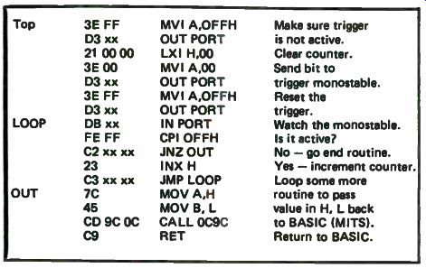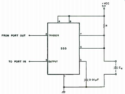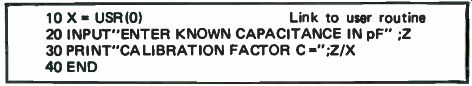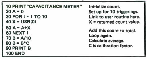 ... software scaled to equal the value of capacitance that determined the length of the monostable (Table 4-5). Software. The whole program can be written in machine language using very little memory, or the count routine can be inserted in memory and called from BASIC via a USR or CALL statement. The example shown in Table 4-6 uses a simple BASIC routine which can be expanded to the desired esoteric level. The count from the monostable is averaged over ten triggerings and the resultant count is then multiplied by a calibration factor to give the value of capacitance used. This count may then be output in whatever form you may choose.