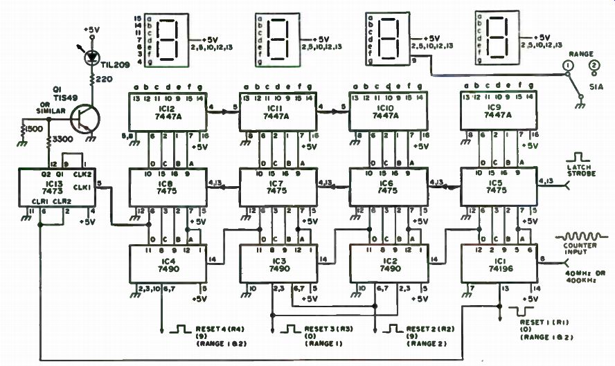 ... over some of the intermediate control circuitry and merely connect the 10 Hz to this three-digit divider-display chain, the display would consist of the right-hand digit showing tenths of seconds, the middle digit showing unit seconds and the left-hand digit showing tens of seconds. You now have the comparator, the range switching and the 2N3904 interface. All you have to do is use it to stop the clock when the charge on the capacitor under test reaches the comparator reference voltage. Interpose some logic circuitry between the 10 Hz pulses from the 7492 and the three-digit counter display as follows. A third section of the 7408 AND gate package is used as a gate. One side of this gate is fed by the 7492 with its 10 Hz output. The second output to this gate is a series chain of the output of the 2N3904 feeding into a 7474 D-type flip-flop used as a synchronizer. The output, A, of this flip-flop then goes to the 7408 section being used as a gate. The 7474 makes sure that you always get a full final pulse or count through the gate no matter when the comparator triggers at the end of the measuring cycle. Note that its clock input is fed from the 10 Hz source. Now let's take a quick trip through the whole shebang to see what happens when you measure a capacitor. Suppose you have an electrolytic which is marked 6 uF and you want to check it. With the function switch in the OFF position, you connect the test leads to the capacitor, being careful to observe polarity. The test voltage does not exceed 5 volts. In passing, if the capacitor has not been in service, take the time to form it for a few short minutes at near its rated voltage, or your reading can be way out of the ball park. Set the range switch to Times One, as this will basically measure up to 10 uF, which will be shown by a readout of 10.0 (this range will really go up to 99.9 uF, but it will take 99.9 seconds to do so, which makes another range more logical for a larger capacitor). When you throw the function switch to Test, things begin to happen. The short is removed from the capacitor and it begins to charge. The 60 Hz is squared up and divided by six, feeding the gate and the synchronizer. The 7490 counter chain has had its reset bus grounded so that it can count any pulses coming its way. The output of the op amp is now highly negative, making the collector of the 2N3904 high (positive 5 volts). This high is applied to the D-input of the 7474, and the first low-to-high transition of the 10 Hz signal applied to its clock input causes its Q-output to go high (and stay high). This TTL high is passed to the clock pulse gate, causing 10 Hz pulses to be passed to the 7490 divider-readout chain, and the readout begins. When the charging cycle finishes, tripping the comparator output positive, this makes the collector of the 2N3904 go negative. On the very next low-to-high transition of the 10 Hz clock which is applied to 7474, the Q of this flip-flop goes low, which shuts off the time pulses to the 7490 count display chain. Now you merely multiply the range switch setting by the indicated time on the display and you have your capacitor measured. Now for a few notes on calibration: The range multipliers are in decade ranges of 1, 10, 100 and 1,000. As nosed on the schematic, the resistor values for these ranges are one megohm, 0.1 meg 10k, and 1k. Five percent resistors will do a decent job, but 1 percent resistors are preferred for aesthetic reasons if not for practical ones. Electrolytics are generally any thing but what is marked on the pretty package, generally erring heavily on the high side of what you think you bought. Oil-filled or large paper cups are generally truer to the mark, but, like all generalities, this can lead you astray. To start, let's assume that you have one favorite 5 uF oil-filled capacitor that you know is on the money (you checked it in the well-equipped CB shack of the guy next door). Connect it to the machine (ignoring polarity, as it is not electrolytic) and start a testing cycle naturally using the Times One range (one meg). If you have started out with the variable element of the voltage divider feeding the inverting input of the op amp set to the middle of its range, you will probably be close to the mark. Adjust this variable trimmer resistor on subsequent timing cycles until the display agrees with your known value of capacitor. Be sure that you have the function switch in the OFF position at least 30 seconds between successive measurements on the same cap to guarantee that it is once again discharged. If you do not, then your readings will vary. This is the entire calibration effort, for, if your range resistors are on the money, then the other ranges should be in good shape. A good quality multiturn trimmer resistor is a must for the calibrating pot. Anything else will lead to frustration. There is nothing magic about the plus and minus 9 volts. My particular zeners came out at 8.8 volts, which worked fine. The choice of readouts is optional. I used RCA DR2000 incandescent units, as Herback and Rademan was selling out some readout kits from RCA at an unreal $2.00 per digit, including PC board and decoder-driver IC. As shown in the diagram, the segments are fed through a diode to lower the 5 volts to about 4.2 under load. This way, the life is extended. LED readouts are perfectly acceptable according to personal taste; it just means that you have to add the usual current-limiting resistors to the circuitry. An open capacitor will show no count a shorted capacitor will make the display count forever. This is handy, as it gives you a clock that counts up to 99.9 seconds for timing any event in that range. It could even have a darkroom spin-off for photo buffs. Adrift Over Your Cs? Once upon a time capacitors were nicely marked 0.1 uF or even 0.05 MFD. But now it is necessary to deduce their value from a rainbow of bands or spots, not to mention such numberings as 4k7, 5n, 5pj. Is that last color