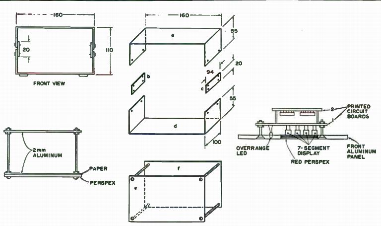 To suppress spikes from TTL integrated circuits, it is essential to connect a few capacitors of 0.1 uF and 50 or 100 uF tantalum at intervals on both printed circuit boards. The 0.1 uF capacitors are Siemens, type B32540-A3104-J metallized polyester. Their advantage is very low induc tance, but even the ceramic disc capacitors will do the job. Be careful about the polarity of tantalum electrolytics. By the way-the IC22 regulator needs a heat sink to dissipate about 3w. A small piece ( 100 x 100 mm) of 2 mm (approximately 14 gauge) aluminum is more than adequate; if a metal box is used, just mount the regulator on the rear side of the box. Construction. Mechanical construction is probably the weakest point of most of the equipment. Not everybody has a well-equipped mechanical workshop. But C-meters can be built in your home. One can be built into a homemade cabinet. The basic dimensions and the general idea are shown in Fig. 4-6. U-shaped parts a and d can be bent in a big vise. The other parts are very simple. Aluminum (2mm, 14 gauge) can be used for all parts of the cabinet. Start with parts a, b, c and d, and then measure the inside dimensions and cut front and back panels e and! accordingly. The front and back panels are held 94 mm (inside dimension) apart by means of four 4 BA screws 102 mm long. This sub-assembly is then inserted between the two U-shaped parts a and d. Parts b and c prevent the front and back panels from moving and hold parts a and d together. After drilling all necessary holes into the front and back panels, clean the front panel and mark all holes with a pencil on a piece of thick white paper which does not change its dimensions with moisture. A white plastic sheet would be even more suitable. Cut off all the marked holes with a sharp knife. Use transfer letters (Letraset or similar) for descriptions of the functions on the panel. Then cut a 1.5 mm thick piece of clear Perspex (Plexiglas) and drill all holes with the exception of the ones for display LEDs and overrange LED. Cut a piece of red Perspex (3 mm thick) which will fit exactly into the hole for the LED display in the front metal panel e. Perspex is supplied with paper sheets glued on both sides. Do not remove these; mark all the holes and outside lines with a pencil and then make cuts with a sharp edge along the outside lines, about 0.2 mm deep. Use the sharp edge of a small chisel (along a steel ruler) with success. Do only one cut at a time. Break both ends of the cut slightly with your fingers. Lay the Perspex over the edge of the bench and break carefully. Try this procedure a few times on Perspex off-cuts. The operation is not difficult but does require a bit of practice.