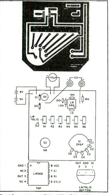 The second part of the C-meter can be checked with a frequency counter (output from IC14D pin 6). You must, of course, simulate the function of the range switch S1B. Output frequencies (at pin 3 of IC14C) must be exactly at the ratio of 1:100. The latch and reset pulses can be checked with an oscilloscope or, preferably, with a logic probe. Alignment. If both parts of the instrument work satisfactorily, solder the two printed circuit boards together. Five thick wires should be soldered onto the counter board. To make this operation easier, use differently colored insulation on the interconnecting wires. The same applies to the range switch wiring. Check the output voltage of the power supply. If possible, load it with a 6.8 ohm resistor to check if the, output voltage is stable. This checking is important, as any voltage over 5.25v can damage some integrated circuits. Then check the current consumption of the whole unit. It should be under 0.75 A. If everything is alright, you can start with alignment. Set "Zero Adj" (ZA) and "Zero Preadj" (ZP) to the center positions. Solder a few (two or three) capacitors, which are stable with temperature, across the Cx terminals (inside the cabinet). Used plastic molded silver mica and polystyrene. In parallel, solder a small mica trimming capacitor (20 to 50 pF). The total value of all of them should be about 980 pF. They form capacitor C F. The difficult problem here is to get hold of a very accurate capacitor whose value is between 5000 and 10,000 pF. The future accuracy of the instrument depends upon the accuracy of this capacitor. So have a good look around for it. Note that either input terminal is grounded. Of course, the one marked "+" is not very sensitive to hum, etc. With no capacitor Cx you should be able to adjust the instrument to show zero on the display, with the values of resistors 12k and 22k next to ZA and ZP. But if you used a crystal of a frequency lower than 40 MHz, these resistors will be slightly higher in value (say 33 and 10k) and vice versa. By the way-they must again (like ZA, ZP and C F) have a very low temperature coefficient. It is best to start with ordinary resistors and replace them, after finding the right values, with high stability ones. Anyway, adjust zero with ZP and then connect the precise capacitor Cx. If it reads low, adjust capacitor C F to the lower value. Remove Cx and adjust zero with ZP (changing 12k and 22k if necessary). Try it again with Cx and adjust C F. Remove Cx and adjust the zero with ZP. (Basically, when the display shows a low value, you must lower the value of Cr, and vice versa.) Continue in this way until the display shows zero without Cx and the right value with Cx. During this procedure ZA is adjusted to the middle position. And that's it. Now you can take, say, 20 mica or polystyrene capacitors 200 to 500 pF, measure each one of them, mark the value and add them one after another in parallel on the terminals of Cx. The difference in total readings should at any point be not more than ±2 digits. If more, then the insulation between terminals 10 and 11 of IC21 (MMV) or between terminals Cx is bad and must be improved. This procedure of adding measured capacitors in parallel, demonstrated the excellent linearity of the SN74121 MMV. It is really amazing how these small plastic 14- and 16-legged spiders perform. The higher range 2 does not need any alignment, as it is automatically alright when the lower range 1 is adjusted. Conclusion. Inside the cabinet, the integrated circuits, display, IC22, etc., dissipate over 5w. Certain crystals tend to be unstable at the high temperature which can develop when the instrument is switched on for a long period of time. In this case, drill a lot of small holes in the top and bottom of the cabinet in order to allow air to circulate along the printed circuit boards. Take advantage of this instrument-it measures with practically full accuracy within a second of being switched on. Just adjust the zero by means of ZA (with range switch in position "pF," even when measuring in the nF range) and connect the capacitor across the terminals Cx. If you measure a lot of capacitors, check the zero from time to time, as it drifts slightly with temperature. The overrange flickers when you exceed the range. This is much better than a steady signal. If you are measuring solid tantalum capacitors, connect them with the correct polarity at terminals Cx. The polarizing voltage across these terminals is about 3v DC. This low voltage limits accurate measurement to only low voltage electrolytic capacitors. If the reading is not stable and changes by more than ± 1 die, then there is something wrong with the capacitor and you would do best to throw it away. How Many pF Is That Capacitor, Really? Tucked away in our junk box someplace, most of us have jars, boxes, paper bags or whatever of surplus capacitors- capacitors that are perfectly usable but not particularly useful because we can't decipher the color code or numbering system that designates their value. Many of us have also had occasions when we wished to twist up a "gimmick," or check the value of an unmarked air-variable or determine the exact value of a ceramic disc before we install it in a particularly critical circuit. The more sophisticated tinkers may recall a time when they wanted to measure the stray capacitance between the leads in a wire bundle or between the foils on a printed circuit board. If any of these situations sound familiar, read on, because here is a project to help you out of all those dilemmas. When completed, it will provide you with the capability to measure any value of capacitance between 0 pF and 1 uF by merely pushing a button and reading a meter. Not only that, the cost is reasonable, construction is quick and easy and the parts are available from your nearest Radio Shack or mail-order parts supplier if they aren't already in your junk box. The circuit is an adaptation of an old principle