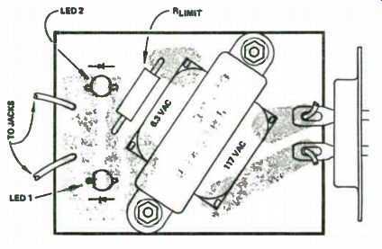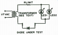 Ultra Simple Diode Checker This simple diode checker is an up-to-date version of an idea that has been around for a number of years. It can be built in one or two evenings from the parts in most experimenter's junk boxes. The parts required are one resistor, two LEDs, and any 117v AC transformer that will provide from 3 to 25v AC. Discarded audio interstage transformers from old tube-type radios and TVs can be used. If all new parts are bought, the cost will be about $5.00, including the small aluminum box. The small cost can be recovered many times over by buying unmarked, untested, manufacturer's closeouts, diodes by the pound, etc., available from most discount mail-order houses (like Poly Paks). Bad diodes can cause disastrous results in some circuits and can be difficult to detect and locate in other circuits. It is a wise precaution to check them all before installation. This simple diode checker was conceived and built for just such purposes. The Circuit. The simple schematic is shown in Fig. 6-1. The trans former provides a low AC voltage, through the current limiting resistor, to two LEDs connected back-to-back. The diode to be tested is connected in series with this combination and the return side of the transformer. The LEDs will respond to the four possible conditions of the diode under test. If the diode is open, no current flows and neither LED will light. If the diode is shorted, one half cycle of the AC voltage will light LED1 and the other half cycle will light LED2. Since each LED is lit 60 times per second, a shorted diode will cause both LEDs to appear lit continuously, ff the diode is good, LED1 will light when the diode's anode is toward the return side of the transformer and LED2 will light when the diode's cathode is toward the transformer return side. By proper physical arrangement of the LEDs and diode, the LED near the diode's cathode will always light. The resistor should be sized to limit the current through the LEDs to about 10 mA. Most LEDs will have a voltage drop of about 1.5 volts across them and most signal-type diodes will have from 0.1 (germanium) to 0.5 (silicon) volts drop across them. The resistor value can then be found by subtracting these two voltages (say 1.5 and 0.5) from the transformer voltage and dividing by 10 mA: VXFMR - 1.5 - 0.5 R - 0.010
