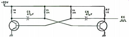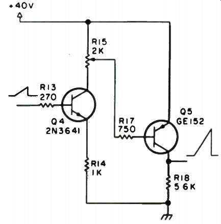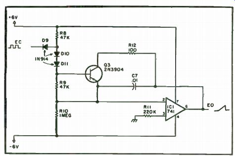 ... sawtooth (Fig. 6-9). The required control voltage, EC, is obtained from an astable multivibrator. When EC is high, D9 is reverse biased and the positive voltage, applied through R8, holds Q3 in saturation. R12 is thus in parallel with C7, the timing capacitor. E0 is then essentially zero. When EC goes low, D9 conducts and D10 and D11 are reverse biased. Q3 turns off and the circuit begins to integrate at the rate of I R10 x C7 volts per second. This rise continues until the control voltage again goes high, driving Q3 to saturation and discharging C7. With the components shown, the rise is approximately 560 volts per second. The amplitude of the ramp produced is dependent on the timing rate, limited by the voltage applied to the integrated circuit.