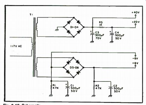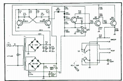 Figure 6-10 shows the astable multivibrator that produces the control voltage. The timing components are C5, R5 and C6, R6. The time interval of conduction of the transistors is given by: T = 0.692 x C x R. With the components shown, pulses of approximately 7 milliseconds duration are obtained with an amplitude of 18 volts. This is quite adequate to control the sawtooth generator. The sawtooth from IC1, approximately 4 volts in amplitude and of 7 milliseconds duration, is applied to a two-stage direct-coupled amplifier (Fig. 6-11). Output from the amplifier section is a 40-volt sawtooth whose duration is somewhat less than 7 milliseconds, having lost a bit due to the bias on transistors Q4 and Q5. Q5, a GE152, is the only critical component in the tester. It must have good linearity, low leakage and an adequate voltage rating. The power supply (Fig. 6-12) is designed to provide both positive and negative 6 volts from a single low-voltage secondary. A bridge rectifier is connected with equal loads on its positive and negative outputs. Equal current flows in both loads; hence, equal voltages of opposite polarity are developed. These power the LM741. The high-voltage secondary provides +40 volts for the output amplifier, which ensures that the test sawtooth will be sufficient amplitude for the range of zener diodes normally encountered in the shop where this tester is in use. R3 is used to drop the +40 volts to +20 volts to power the multivibrator. The zener diode tester is quite simple to use. Connections are made from the tester to the vertical and horizontal inputs of an oscilloscope whose vertical amplifier is set for DC and whose horizontal amplifier is set for external. The zener diode is connected to the test terminals and a graphic representation of the zener characteristics is displayed on the oscilloscope screen (Fig. 6-13). The zener voltage may be read on the screen if the oscilloscope is calibrated. A polarity-reversing switch is provided for convenience in switching the polarities of the test terminals. A normal zener will produce a distinctive trace, while a defective device will be readily apparent (Figs. 6-14 and 6-15), thus facilitating rapid testing. Figures 6-16 and 6-17 show the layout used in the prototype of this tester. Nothing in the layout is critical, which means a great deal of variation is possible, so you can make use of any available parts.