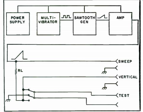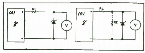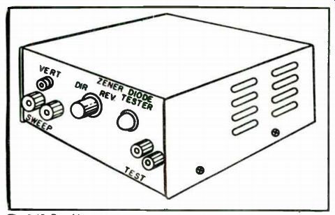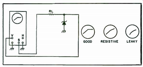 The holes should be cut in the box, and it should be painted and labeled to suit the builder's taste. The current limiting resistor and transformer should be mounted to the circuit board next. The AC plug and pin or banana jacks should then be mounted in the box, with short lengths of wire soldered to them. Next, insert the LEDs and bend their leads so that they will not fall out. Do not solder them yet. The LED leads must be long enough for the LEDs to protrude through the box, so the builder may have to add short lengths of wire. Now feed the four wires from the AC plug and the jacks through the proper holes in the circuit board, check for proper fit and clearance and solder the four wires. Position the LEDs and solder them to the circuit board. Put insulation on the inside of the box bottom to prevent any possibility of shorts to the circuit board. Don't forget that it has 117v AC on it! Make adapters to fit your jacks and you are ready to check out the unit. Test the checker by applying power to the 117v AC plug. Neither LED should light. Now put a short circuit across the jack terminals and both LEDs should light. A diode that is known to be good should now be connected across the jack terminals. The LED closest to the diode's cathode should light. Try it both ways to make sure the LEDs are oriented properly. After building and using this simple diode checker, the owner will find a desire to also know, if the diode under test is silicon or germanium. Since a germanium diode will develop about 0.1 volts across itself and a silicon diode about 0.5 volts, it seems that some very simple circuit might be devised that would light an LED if the diode under test were silicon. The Amazing Zener Sweeper Tests Zener Diodes Have you ever acquired a packet of unmarked, untested zener diodes from one of the surplus dealers? Perhaps you have discovered that sorting and testing 100 such zener diodes is a rather formidable task. The common method of testing a zener diode is by connecting the zener in series with a limiting resistor across a variable voltage source and metering the zener voltage (Fig. 6-6A). As the supply voltage is increased, the voltage across the zener diode will be equal to the supply voltage until the zener point is reached. At that point, the voltage across the zener will cease to rise with further increase in the supply voltage, and the meter will indicate the zener voltage. This test, however, does not make it readily apparent whether or not the zener under test is leaky. In Fig. 6-6B, this zener diode leakage is represented by RZ in parallel with the diode. The applied voltage will divide across RL and RZ until the zener point is reached, at which time it will stabilize. In this case, the voltage across the zener diode increased with increasing supply voltage, as it should, but it was less than the supply voltage. The shortcomings of this method can be overcome by using a sawtooth test voltage and monitoring the zener voltage with an oscilloscope whose horizontal sweep is driven by that sawtooth. This is possible with an oscilloscope that provides front-panel access to its internally-generated sweep voltage, as shown in Fig. 6-7. The displayed ramp will rise to the zener point, beyond which it will be a horizontal line. If the zener passes current before the zener point is reached ( is leaky), the ramp will be curved. If the zener does not go into complete conduction at its zener point (is resistive), the horizontal trace will continue to rise. This would seem the ideal method, but it does have several disadvantages: • Not all oscilloscopes provide front-panel access to the sweep voltage.