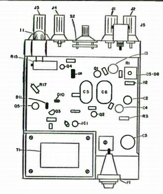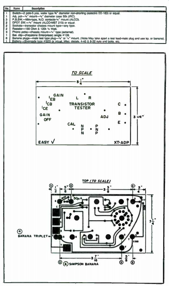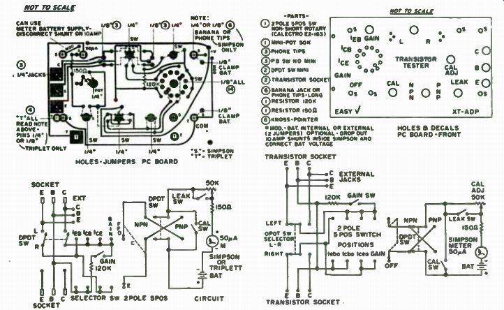 The Multimeter Test Meter, Simpson or Triplet type, has become the technician's and serviceman's most handy and important tool for servicing on the spot today. This Simpson test meter made possible the fast checking of tube circuits and other electronic parts on the spot on complex systems and important electrical and electronic devices. Today this same meter is being used on the new state-of-the-art printed circuit cards, solid state circuitry, transistors, diodes, etc. This adapter/conversion board makes possible the simple change over of a common test instrument (Simpson or Triplet) into a transistor tester for on the spot testing of normal defects of transistors, diodes or other solid state devices. For a complete parts list, see Table 6-1. Using the standard Simpson 260 meter, a printed circuit card adapter, with a circuit for testing general type NPN and PNP transistors and solid state components for defects, is "piggy-back, plugged-in" over the existing controls on the meter. The settings are then set to 50µA and DC on the meter controls. This results in now having a full transistor tester with new controls on the printed circuit adapter (Fig. 6-18). Connect the PC board to the meter by way of the mounting banana male studs. This makes the necessary connection to the Simpson 50 microammeter direct. Add the clip-on battery, to complete the conversion of the ...