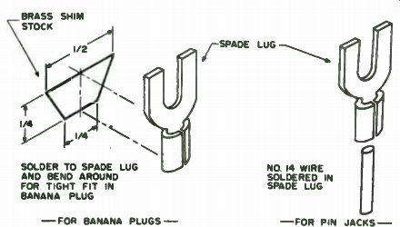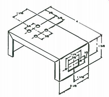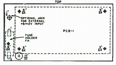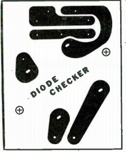 For a 6.3v AC transformer, the resistor value is 430 ohms. A 330 or 470 ohm resistor will do. Its value is not critical. Construction. The simple circuit lends itself well to point-to-point wiring, which is probably the quickest way to build the checker. If the builder prefers a neater appearance, the printed circuit board layout shown in Fig. 6-2 can be used. It is easy to duplicate with an etch-resist pen, or, if a professional look is desired, by photographic means. Figure 6-3 shows the parts placement for the circuit board and Fig. 6-4 shows the matching hole locations for mounting it in a 4 x 2-1/8 x 1-5/8 box. A Radio Shack 6.3 volt transformer, stock number 273-1384, was used for the circuit board layout and hole patterns. No on/off switch is used. The unit is simply plugged in for use. A TV cheater cord plug and socket are used so that the diode checker is easy to store without dangling AC cords everywhere. Pin jacks, banana jacks or five-way binding posts can be used for connecting to the diode to be tested. The binding posts allow for a variety of connections to diodes that cannot be brought directly to the checker. Adapters with a V-notch are used so that loose diodes can easily be dropped into place for testing. Figure 6-5 shows two easy methods of making such adapters.