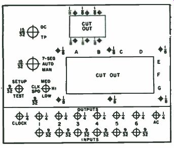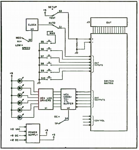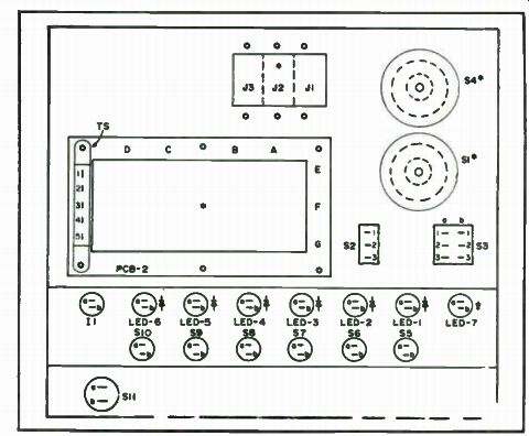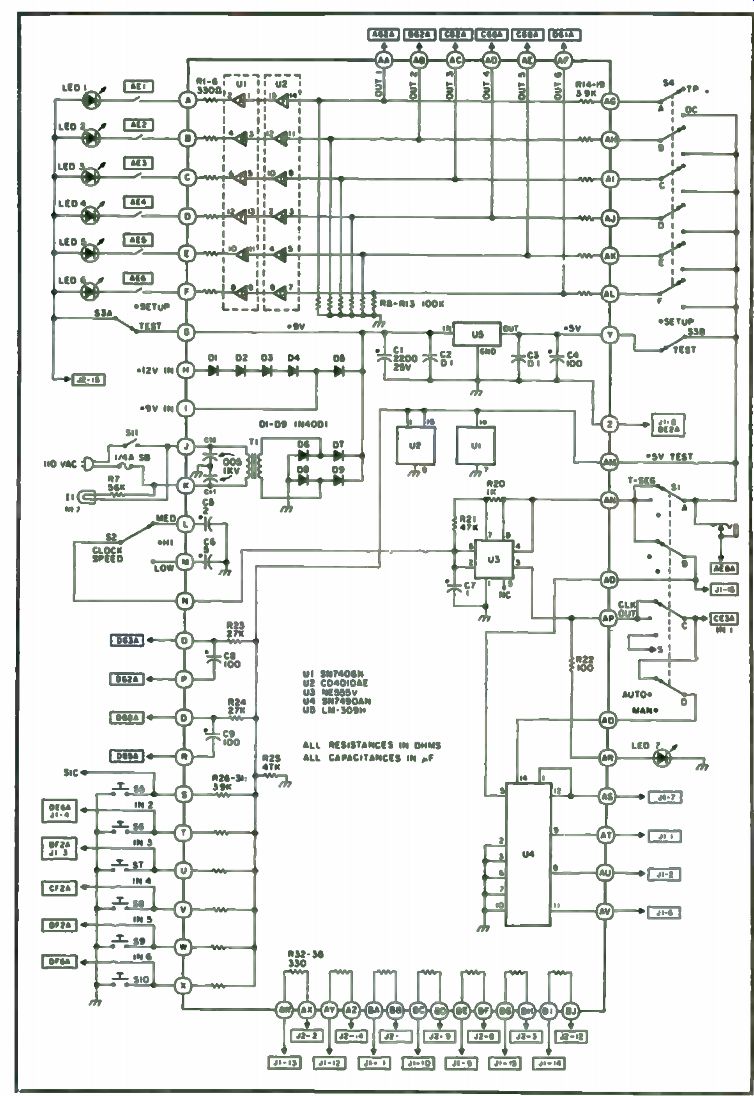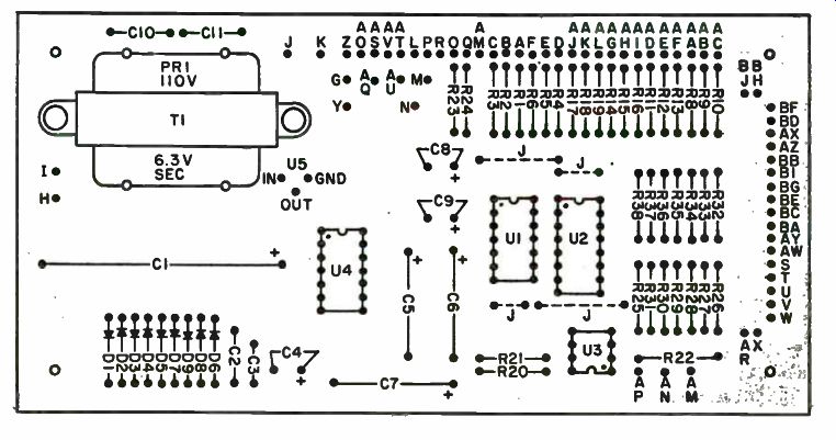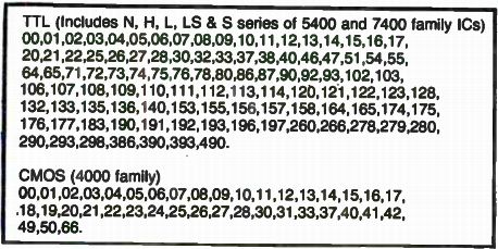 Power Supply. A conventional full- wave rectifier bridge (D6-D9) and a +5v regulator (U5) are included to power all logic circuitry, as well as the DUT. A separate +9v + 12v DC input jack may be installed by those desiring complete portability. The external battery supply voltage is dropped to about +8 by D1-D4, to reduce the voltage drop across, and hence, the amount of heat dissipated by U5. The diodes also provide battery polarity protection. The +5v supply line powers the DUT and the tester circuitry only when S3 is in the TEST position. This prevents inadvertent application of input logic levels prior to application of Vcc to the DUT, since the input logic levels are themselves derived from the same +5v line. With S3 in the SETUP position, all input, output and Vcc lines to the DUT socket are returned to ground. An optional 0-100 milliammeter can be inserted in the Vcc line to the DUT to monitor the current required, or the Vcc line can be run to a closed-circuit three-way jack to permit external monitoring with your VOM. 7-Segment Decoder-Driver. Special provisions have been included on the logic printed circuit board to allow the popular SN7447A7-segment decoder-driver to be tested. The output pulse stream from U3 is fed to an internal dedicated BCD counter, U4, and the four binary output lines are led directly to Ji. Since this IC socket is dedicated for testing only the 7447A, the input and output lines required can be hardwired to J1 and J2. A common anode 7-segment display can be permanently installed at J2. When testing the 7447A, Si is set to 7-SEG and J1 is used as the test socket instead of J3. U4, J1 and J2 are optional, but considered very useful to extend the tester's capabilities to the ubiquitous 7- segment decoder so popular in digital displays, counters, DVMs, etc. The internal BCD counter, which is hardwired to JI, allows the 7-segment display to cycle through all numerals 0-9 continuously. Additionally, the all segments on and all segments off tests can be performed on the 7447A under test. Construction. The LMB 007-746 sloping panel cabinet was selected since it is both attractive and conforms to the physical layout requirements of the panel controls. The entire logic circuitry, shown in Fig. 6-22, including the power transformer, is implemented on a single PC board. The DIP switch matrix is on a second PC board. Thus, there are no components external to the PC boards except the required controls, LEDs jacks and switches. The switch matrix board (PCB-2) is wired (wire-wrap or point to-point) prior to installation, to reduce interconnection time required between it, the main logic board (PCB-1) and the panel controls. The use of IC ...