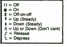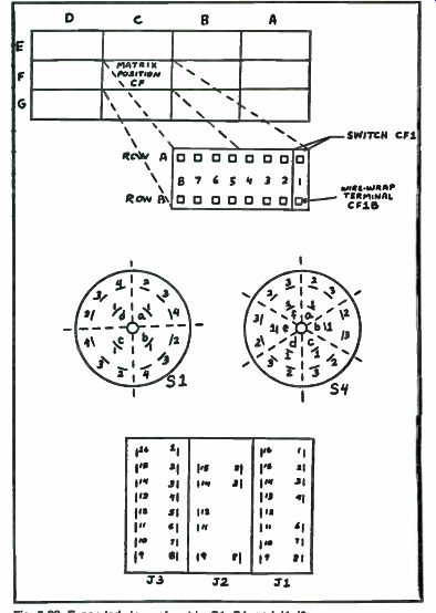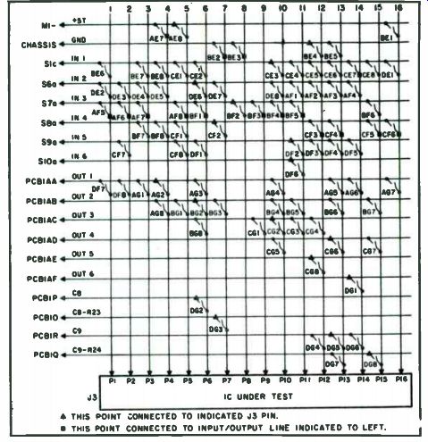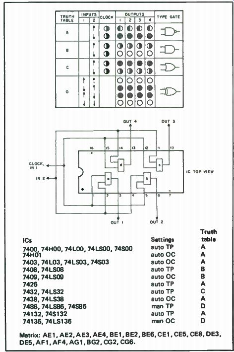 ... sockets on PCB-2 permits the DIP switches to be removed temporarily for other uses, if desired. PCB-1 is laid out to accept IC sockets for each IC, although the use of sockets is not mandatory. Ribbon cable is used to interconnect the PCBs and controls, although a combination of wire-wrap and point-to-point wiring can be used. A significant measure of flexibility can be added to the tester by using an IC clip and ribbon cable which connects toJ3. This permits very rapid testing of many ICs of the same type and also greatly extends the lifetime of J3. Either 14- or16-pin ICs can be tested directly, since the DIP switch matrix programming accounts for pinout differences as long as pin 1 of the IC clip lead (or J3) is always connected to pin 1 of the 14-or 16-pin DUT when testing. Operation of the IC Tester. Due to the wide variety of IC functional pinouts, it is necessary to set up the DIP switch matrix to interconnect the input/output signal lines to the proper IC pins for each different functional pinout, but not necessarily for each different IC. For example, Fig. 6-25 and Table 6-4 show a sample truth table page, which can be used for testing many IC types. There are four related parts to each page-the listing of ICs testable by the matrix settings on that page, the matrix settings, the truth table and, for easy reference, the pinout configuration for each IC listed on that page. For a complete parts list for this project, see Table 6-5 and Figs. 6-26 and 6-31.
