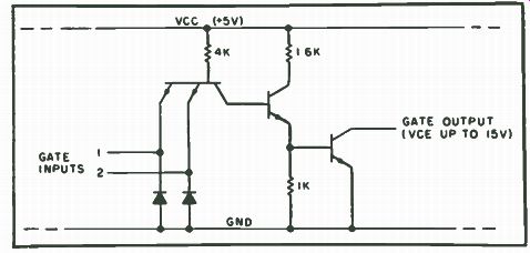 The +5 Vcc (Vcc and Vdd for CMOS), GND and other input signals lines are also connected to the proper pins of the DUT, via the switch matrix. Monostable multivibrators (e.g., 74121, 84122, 74123) require timing resistors and capacitors for proper operation. These are R23, C8, R24 and C9 in Fig. 6-22, and have been selected to give approximately a 1/2-1 second low-high-low indication at the respective output monitor. Output logic states of the DUT are led from the switch matrix through a hex CMOS-to-TTL buffer to individual LED drivers for display. A high output logic level (logic 1) from the DUT lights the LED, and a low output logic level (logic 0) is indicated by an unlit LED. Unused output LED indicators remain unlit. During setup, S4 is placed into either the OC or TP position, depending on whether the DUT is of the open-collector or totem-pole output variety. This action connects or disconnects a pull-up resistor to each logic output pin of the DUT. The pull-up resistors are required only for open-collector ICs, since the output transistor collector is un-committed (Fig. 6-23) for high voltage or high-current applications, whereas the totem-pole output transistor collector is connected internally to another transistor (Fig. 6-24) to provide direct TTL output levels without the requirement for an external pull-up resistor. ---------------------- Table 6-3. Static and Dynamic Testing Comparison. Type of testing Clock frequency Complexity Commercial cost Static testing Dynamic testing Functional Truth table compliance Icc ( quiescent drive current) Low to medium Simple-switches and logic indicators $500-$1000 Full parameter Propagation delay Max toggle frequency Noise immunity Min. clock pulse width Fan-out/Fan-in Near maximum rated Very high-normally special-purpose or custom-designed ROM or microprocessor-controlled $1500 (benchtop) to over $50,000 ( production line) ----------------------