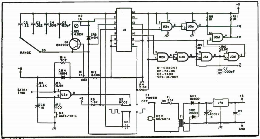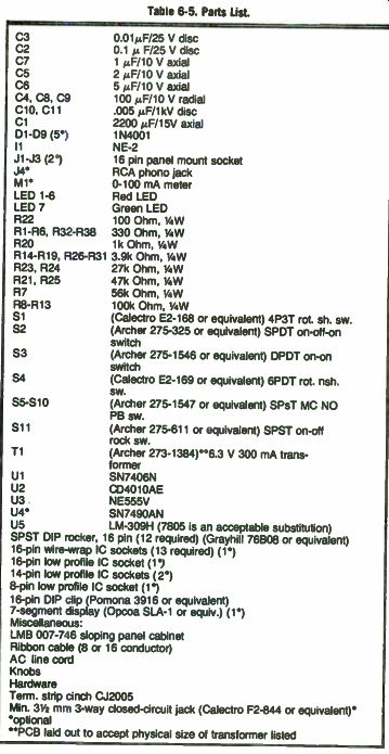 ------------------- Table 6-8. Parts List. C1 4000 µF, 16 V, electrolytic capacitor C2 0.22 µF C3 0.022 µF matched set, polycarbonate C4 0.0018 uF capacitors C5, C8 120 pF C6 10 µF electrolytic capacitor C7 1000 pF, disc capacitor C9 0.1 µF disc capacitor CR1, CR2 1N4001 rectifier diodes CR3, CR4 1N914 switching diodes F1 0.25 Amp slow-blow fuse 01 2N2907 transistor R1 1000-Ohm wire wound potentiometer R2 1000-Ohm trimmer potentiometer R3, R4, R5, R10 5600-Ohm, 1/4 - Watt resistor R6 3300-Ohm, 1/4 - Watt resistor R7 100-Ohm, 1/4- Watt resistor R8, R9, R11 1000-Ohm, 1/4- Watt resistor R12 3400-Ohm 1%, 1 / 8- Watt, metal film resistor R13 4020-Ohm 1%, 1 / 8- Watt, metal film resistor R14 Trim-on-test, 1/4- Watt resistor, approximately 1000 Ohms Si SPST slide switch S2 DPDT slide switch S3 1-pole, 4-position rotary switch S4 NO momentary push-button switch Ti Power transformer, 115 V 60 Hz primary; 16 V c-t at 1.5 Amps secondary U1 CD 4047AE oscillator U2 74L00 low-power quad two-input NAND gate U3 7403 open-collector quad two-input NAND gate VR1 UA7805 IC voltage regulator Misc. Perforated circuit board, suitable enclosure, line cord, 5-way binding posts, control knobs, fuse clips, hookup wire, solder, hardware. ---------------------