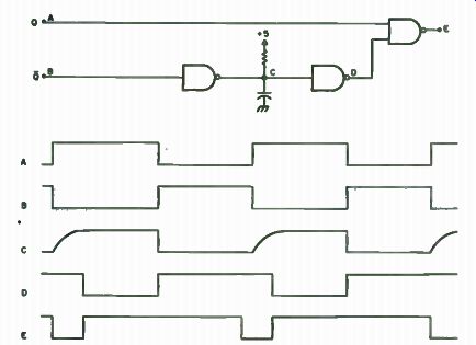 The CD 4047 has an internal divide-by-two flip-flop and therefore produces highly symmetrical square waves at terminals 10 and 11. Gates U2C and U3A couple and buffer the Q output, and gates U2B and U3B act similarly for the Q output of the oscillator. An open-collector gate was chosen as the output device, in spite of its slower rise time, because of its wired-OR capability and its inherent immunity to accidental shorts to ground. A 1 ps pulse is generated by combining a delayed Q with an undelayed Q. Figure 6-33 shows this circuit and its corresponding timing diagram. As a rule of thumb, a 6000-ohm pull-up resistor and a 1µF capacitor will yield a 1 ms delay. This relation is quite linear with capacitance. If, in your particular application, a pulse width other than 1 ms is needed, just change C7 to the required value. Monostable Oscillator. The monostable mode is established by grounding U1-8 (through U2A) and by applying a logic " 1" to pin 4. The one-shot is triggered by momentarily raising the level at pin 8. This is accomplished by the output of gate U2A, which will go high when either the GATE/TRIG terminal is grounded or push-button switch S4 is depressed. R7 and C6 act as a debouncing circuit. The period of the one-shot is related to the astable frequency, such that T 1/f. A correction capacitor C8 shunts all range capacitors (C2-05) in the monostable mode. -- Next: Digital Voltmeters