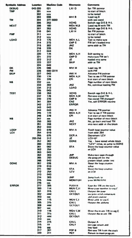 How to Find a Forgetful Computer Memory Simple memory diagnostic programs for 8080-based systems have been described and illustrated for its use in troubleshooting 4K memory boards. While those methods are effective for localizing gross defects, such as chips which have one or more bits permanently set, more subtle defects may evade detection. For example, after discovering four bad chips in 8K of memory an attempt was made to load and run SCELBAL--but to no avail. After many hours of checking and reloading scattered addresses with the correct contents, it dawned on the programmer that when the contents of some addresses were corrected, the contents of other addresses were sometimes changing. What obviously was needed was a more thorough memory debugging approach. This project brings us one step closer to that end and SCELBAL is now running fine. Two basic techniques are employed. One technique takes the value of an address and loads it as a data word into that same address. This is done for all of the 256 addresses on a page. Next, the values of the addresses are compared with their respective contents. If they are dissimilar, an error printout is produced. For example, if the eighth data bit (bit 7) at address 023 is always set to 1 due to a chip defect, the actual contents of that address will be 223, which would generate an error. However, if bit 0 of address 023 was always set to 1, no error would be detected. Needless to say, this would cause problems in an actual program which required that bit 0 at address 023 be set to O0. One way that this problem can be overcome is to use a slightly different approach. Typically, this second technique loads a random number into all 1/4 K addresses of a page and then sequentially examines the contents of the 256 addresses to see if they still contain the pattern which was loaded into them. If enough random patterns are tried, a bit at some given address which is permanently set will sooner or later be discovered. However, a not uncommon problem is for two or more addresses to interact. If addresses 023 and 025 were interacting in such a manner that whatever was loaded into bit 7 at address 025 changed the corresponding bit in address 023, then this second technique would not detect the error by virtue of the fact that the whole page was loaded with the identical data word. As if this isn't trouble enough, programs which check only one page of 256 addresses at a time are unable to detect interactions between two or more of the four blocks of 256 bits which actually reside on a single 2101 type memory chip. This program overcomes the shortcomings just listed. When fully implemented, it provides a potent tool for detecting memory problems. About the Program. In this system, the program, which is listed in Table 6-6 resides on page 043, address 200-320 (octal). Relocation should provide little difficulty once the mechanics of the program are understood. The program loads a Test Word (TW), either 377 or 000 (octal), into one address in a 1K segment of the board. It then fills the remaining addresses of the four pages with a Field Word (FW), either 000 or 377 (the complement of the TW). When the four pages have been filled with the FW, the program retrieves the TW which was previously stored in memory and examines it to see if it was altered. If the TW has been altered, an error printout will be produced. If no error has occurred at that address, the next sequential address is loaded with the TW while all other addresses are loaded with the FW. Then the stored TW is once again tested. This process is repeated until each address in the four page block has been tested. The program repeats the above procedure eight times (your option). The reason for repeatedly testing a 4 page block is that the repeated accessing of a particular area in memory will generate additional heat, consequently increasing the chance that marginal chips with thermal defects will be detected. The programmer then sets up the program to check the next block of 4 pages on a board until the whole board has been checked. In order to keep the program simple for beginners, it was opted to have the programmer initialize each successive 4 page block. Obviously the computer could be made to do it, albeit at the cost of making the program more complex and harder to follow. After checking out the whole board, the programmer should change the TW and FW to the values given in brackets in the program, and then test the whole board again. You may encounter a situation where the 377 test word won't be altered by an interaction with a 000 field word, but a 000 TW will be altered by a 377 FW.
