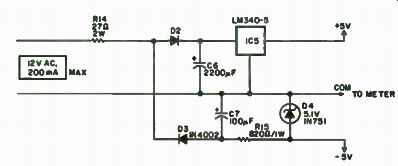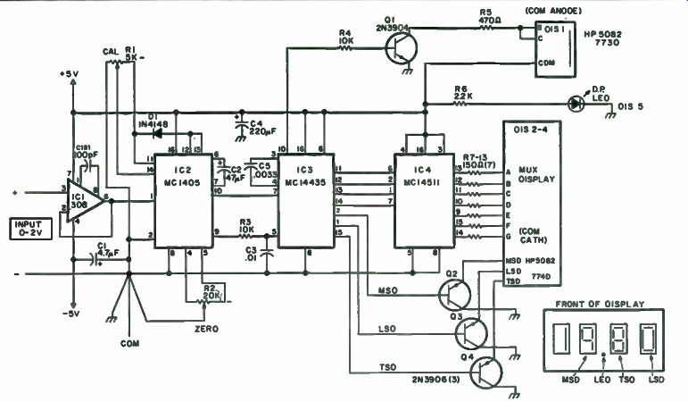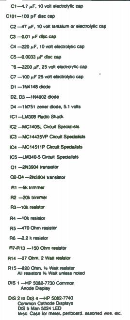 DVMs Get Simpler and Simpler With all the interest in digital electronics, and with prices of the related parts dropping, it seems natural to that much of the equipment in labs could be " digitized. " The result would be that equipment would be much easier to read (no analog meters to interpret) and perhaps the readings would be more accurate. This is part of the justification for this project. It is the design of a digital voltmeter that is cheap and easy to build. It should be included with your power supplies, communications gear, etc. It would also be nice to have a digital multimeter, too. You may be aware of the fact that many semiconductor houses offer digital voltmeter chip sets. These consist of an analog to digital converter chip and a digital counter array chip. All you have to add, at the most, are a power supply, a system clock, a reference source and a display system. That can easily mean six chips and up! This means high cost and lots of construction. But there is a better way. Motorola has introduced a chip set that requires only a power supply and a display system. It's easy to work with and easy to calibrate. And the best part is that it's available and cheap (under $18 for the set), too! Accuracy is rated at 0.05 percent and that is probably worst case! Your voltmeter accuracy will depend upon the accuracy of the standard you use. This project you are about to build is the system the "Cheap and Dirty DVM" is based on. Some of the disadvantages of the DVM should be mentioned. The first one is that it won't measure negative voltages. You have to reverse the input leads for that, like on an analog VOM. The second disadvantage is that the chip set has an input impedance of 4k ohms, but this is changed to 10 megohms input with a $2. 00 op amp in this unit. None of these problems are serious--the first requires a quad op amp and some parts. The second has already been taken care of. If you want to read further about the Motorola chip set, call or write them for the data sheets. Construction isn't too difficult, but there are several areas to watch. Probably the biggest problem you will have is finding a box to house the finished unit. If you want a general purpose meter to be used around your workshop, a minibox will work fine. However, if you want to build a digital panel meter to be installed permanently in a piece of equipment, you are in a sticky situation because digital panel meter cases are very hard to get. Use a small minibox if you're stuck. Cut a rectangular hole in the front of the box and put a red filter behind it. Then cut and bend aluminum stock into two L brackets large enough to fit on the ends of the box. You could then cut a hole large enough to accommodate the box front in your panel and use the L brackets to secure it. Possibly a better way would be to make up an aluminum plate larger than the front of the box and use it to secure the box to the panel. You would have to duplicate the display cutout in the plate, of course, but the result could look pretty neat! If you have never built a digital voltmeter before, you are in for some interesting construction! If you have, these construction hints will sound ... Table 7-1. Parts List. ![]() --------------------------- C1-4.7 MF, 10 volt electrolytic cap C101-100 pF disc cap C2 -47 uF, 10 vet tantalum or electrolytic cap C3 -0.01 uF disc cap C4 -220 µF, 10 volt electrolytic cap C5 -0.0033 uF disc cap '6 -2200 µF, 25 volt electrolytic cap C7 -100 µF 25 volt electrolytic cap D1 -1N4148 diode Q2. Q3 -1N4002 diode D4 - 1N751 zener diode, 5.1 vats IC1-LM308 Radio Shack IC2 -MC1405L Circuit Specialists IC3 -MC14435VP Circuit Specialists IC4 -MC14511P Circuit Specialists IC5 -LM340-5 Circuit Specialists Q1 -2N3904 transistor Q2-04 -2N3904 transistor R1 -5k trimmer R2 -20k trimmer R3-10k resistor R4 - 10k resistor RS -470 Ohm resistor R6 -2.2 k resistor R7- R13 -150 Ohm resistor R14 -27 Ohm. 2 Watt resistor R15 -820 Ohm. 1/4 Watt resistor All resistors 1/4 Wan unless noted DIS 1 -HP 5082-7730 Common Anode Display DIS 2 to DIS 4 -HP 5082-7740 Common Cathode Displays DIS 5 Man 5024 LED Misc Case lot meter, perfboard. assorted wire etc. --------------- ![]() Fig. 7-1. Basic meter. ------------------ ... familiar. The layout isn't too critical, and the parts may be placed nearly anywhere. For a complete parts list, see Table 7-1. The heat generating power supply should be located as far away as possible from the MC- 1405 chip. In fact, try to get it in a separate module. Why the caution? Heat may cause drift of calibration if it is great enough. By the way, this circuit draws around 100 mA from the +5 volt line. Also, when you wire up the LM-308 and the MC- 1405 circuitry, the grounds are critical. Improper grounding causes calibration errors, drift and other problems. You'll notice how all grounds come together at one point on the schematic in Fig. 7-1. This is the way to wire your unit. Remember that this voltmeter can be a laboratory quality instrument if you follow these simple precautions. Six different units should be built. They should all be pretty much alike. First, assemble the display board. Three HP 5082-7740 LED readouts are used for the multiplexed part and an HP 5082-7730 readout is used for the 1 on the display. Note that the 7740 readouts are common cathode and the 7730 is common anode. You could use all 7740s if you wish. Or even Data Lit 704s. You name it in common cathode! A separate LED is used for the decimal point. This makes for easier reading at a distance. The three 7740s are wired up for multiplex operation. This means that all A segments are wired together, all Bs and so on. Homemade L brackets were used to attach the completed display to the rest of the electronics board. The next part of this project is to get the electronics built and running. Figure 7-1 shows the schematic of the basic meter. This is the circuitry that is recommended by Motorola for their chip set, so you'll find it w