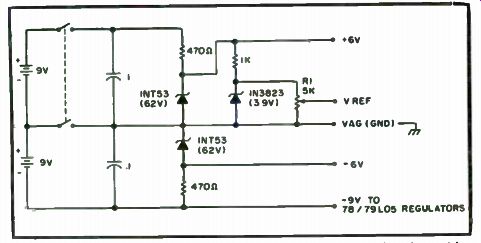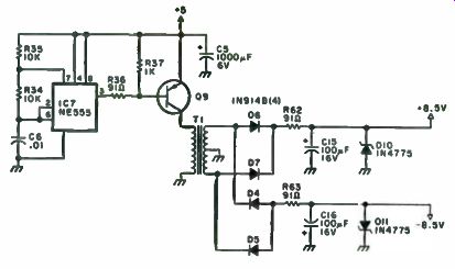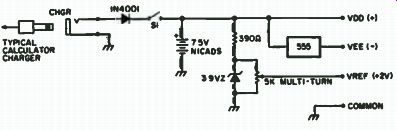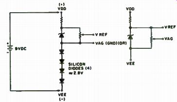 This project is really a bare-bones layout with a minimum amount of functions, but all that is required to upgrade to a full function DVM is a few more resistors and switches. Since the MC14433 requires both a positive and a negative supply, it necessitates either the use of two batteries, or some other way to generate a negative voltage from a positive source. This is really quite easy and there are a couple of different methods to obtain it. One easy way to get it is by the method shown in Fig. 7-5. In this example, a 9 volt supply can be used, with 3v between Vag and Vee, leaving 6v for Vac' to Vag. This system leaves a comfortable margin or battery degeneration (end of life). Note that due to the current requirements of the LEDs, this method is recommended for use only with LCDs. Another method is shown in Fig. 7-6. This method uses the old reliable NE555. Since this thing generates a square wave, why not use only the negative cycle? Looking at the circuit in Fig. 7-7, we see that the 555 is connected in a regular oscillator fashion. The ... ... output, pin 3, is fed through a capacitor to the junction of two diodes. Dl allows the negative cycle to pass through it, and D2 allows the positive cycle to go through it to ground. After filtering, this negative wave is amazingly transformed into DC! An idea for saving money is to use potentiometers in the area of precision resistors on the input circuitry. Sure, precision resistors would be the way to go, but as long as we are being cheap about this thing, let's go all the way. There are definite values of resistors required for proper operation of the input circuitry, but instead of trying to find the closest thing in your junk box and hoping for the best, we will start with a value less than what is required and supplement it with a miniature 10 turn pot, which on the surplus market is relatively inexpensive. That way, you will have an even more precise resistor combination than you could get by ordering it. Although a DVM can be made on a printed circuit board, a perfboard with sockets will do just fine, as parts layout is not really critical. One precaution, though: Try to keep wires away from the clock resistor and wave-forming circuits. Unlike with TTL devices, one cannot leave unconnected leads unconnected. Due to the extremely high impedance of these CMOS devices, you must tie the unused leads to a high or to a low. This circuit can be used with LEDs or LCDs with some changes, but in the interest of the local economy (your wallet), go with the popular FND-70 common cathode LEDs.
