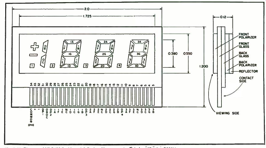 Printed Circuit Boards. More should be about printed circuit boards. Double-sided PC boards with plated-through holes are available, and the price will be in the vicinity of $4.00 to $6.00. This board has provisions for a few more frills and the price of a kit using that board sells for $39.95. Write for details to Dacron, Inc., 12609 Blackfoot Trail, Round Rock, TX 78664. Calibration. The first thing to do in the way of calibration is to set the 200 mV reference voltage (or 2 volts, depending on which option you take). Do this with any accurate meter or another DVM, as the accuracy of the DVM depends upon this setting. Next, with an ohmmeter, set the value of your resistor strings to equal the required resistance, e.g., 5 megohms with a 5 meg pot for the required 9 megohms. Do this with all the resistors. When you have adjusted these to their approximate value, insert them into the circuit. Now you can fine tune the pots to the exact value. Note that when you adjust one pot, it will affect the values of the other ranges. This may take a while, but when it is complete, you will have a very accurate voltmeter. Operation. This is the easiest of all. All that is required is that you feed it the voltage commensurate with the range it is in. While other common voltmeters can take a few "prangs" with the meter movement, do not try to measure 150 volts with the switch in the 2 volt range, for if you do, you will find yourself ordering another MC14433. The schematic and voltage chart for this project are found in Figs. 7-8 and 7-9. Super DVM with LCD If you are not only interested in replacing your old reliable Simpson 260, but are also interested in knowing what makes those funny liquid crystal displays work, your next voltmeter should contain only devices which won't suck up all the juice out of the batteries. Before we get into the actual circuit construction, let's start from the top with design theory. The Display. The operation of a field effect liquid crystal display depends on changing the optical properties of a liquid crystal by applying an electric field. The best short description of a liquid crystal is that it is an ordered fluid. Crystals of this type (liquid) which are used in displays belong to a class called nematic. Fluids of this type consist of cigar-shaped organic molecules with the long axis of each molecule pointing in the same direction. There are three main types of chemicals which are used in displays. These are Schiff bases, esters and & phenyls. At the present time, the Schiff-bases are the best choice for displays, taking into consideration switching times, reasonable threshold voltages, lifetimes, good temperature ranges and expense. The Motorola MLC 400 is constructed from two pieces of glass coated with transparent indium oxide conductors. These conductors are shaped to form the segments of a numeric display. The glass surfaces are also specially treated to align the liquid crystal molecules in a particular direction. Alignment is parallel to the plane of the glass, with the alignment direction of the top rotated 90° relative to the alignment of the bottom plate. This causes the liquid crystal molecules in the cell to assume a twisted orientation, when viewed from top to bottom. The plane of polarization of plane-polarized light will follow this twist and emerge from the cell rotated 90°. Thus, if the cell is placed between crossed polarizers, the polarizers will transmit light. Where an electric field is applied, the liquid crystal will align parallel to the field, twist will be destroyed and that portion of the cell will appear dark between crossed polarizers.