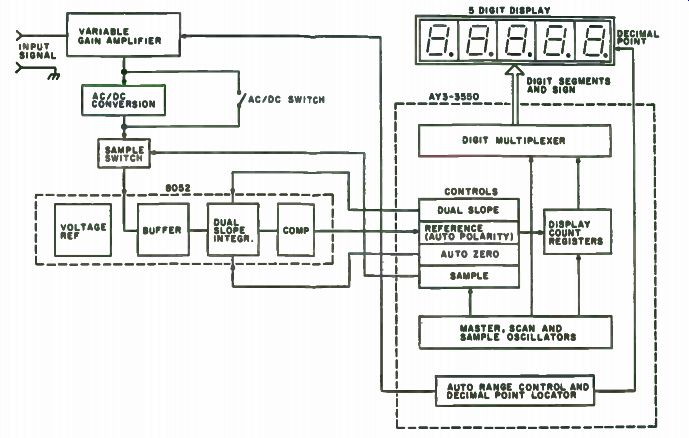 To calibrate the AC scale, the easiest way is to set up the voltmeter to the 200 volt scale and measure the line voltage of your house. If it does not read correctly, turn the pot until it does. Another little hint-be sure not to hook up the analog ground to chassis ground as if you are measuring current in a high voltage circuit. This will place a high potential on the bare metal chassis. The chip is available from Tri-Tek for $18.95. PC boards for a basic 2v DVM using LEDs can be purchased from Dactron, Inc. 12609 Blackfoot Trail, Round Rock, TX 78664. Ecstasy In Multi-meter-land with an Autoranging Marvel The most frequently used and trusted piece of test gear is the VOM. New ICs have changed the appearance of the VOM by taking a giant step in providing numeric readouts in the place of the sometimes difficult-to-read meter movement. Even if the greater accuracy was not considered, the ability to match voltage currents and resistors was greatly improved. How ever, not until recently have the IC manufacturers been able to provide the function we have all been waiting for -autoranging! The operation, construction and calibration of a complete 4-3/4-digit autoranging, auto-zero, auto-polarity digital multimeter capable of measuring DC or AC volts (. 1 millivolt to 2. 9999kv), DC or AC current (1 uA to 2.9999 amps) and ohms (0.1 ohm to 29.999 megohms). The autoranging feature will automatically provide the proper decimal location to give the most significant digits possible. A single 5v supply is all that is needed for operation of the meter. Circuit Description. The block diagram shows how simple the circuitry has become with the introduction of Intersir s 8052 analog signal conditioner and General Instrument's AY-3-3550 4-3/4-digit DMM integrated circuit. ![]() (Figs. 7-16 through 7-19). A voltage of unknown amplitude is applied to the variable gain amplifier. Ideally, the output of the amplifier will be between +2v and - 2v. The output will be converted to DC if the AC/DC switch is in the AC mode. This unknown voltage will be applied to the input of the 8052 (IC11) only when the AY-3-3550 (IC3) is ready to make a measurement. When ready, the sample switch will be enabled for 10,000 counts, the sample switch is turned off, the comparator output is sensed for polarity by IC3 and the polarity data is used to force the dual slope integrator to integrate in the opposite direction. IC3 will store the count required for the integrator to cross zero. This count will be directly related to the amplitude of the unknown voltage. If the integrator does not reach Ov by 20,000 counts, the unknown voltage is too large. In this case, the variable gain amplifier is set to reduce the unknown voltage by a factor of 10 and start the sampling over again. If the count is less than 1800, then the variable gain amplifier has insufficient gain. In this case, the gain will be increased by 10, and the sampling will repeat. Note that as the gain is changed, the decimal point is shifted. Between voltage samples, the autozero circuit of IC3 will recalibrate specific capacitors so that the new measurement will start from zero.